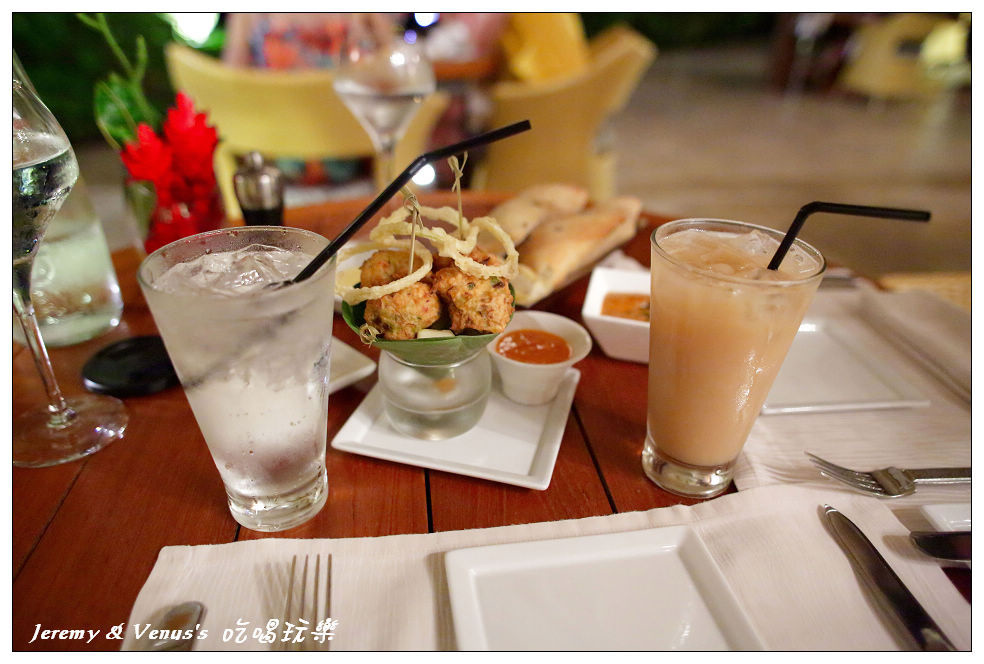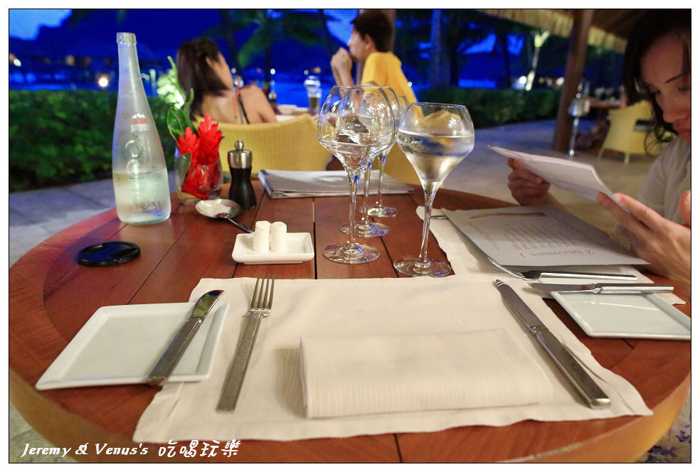 傍晚,在泳池泡水後,我們又回房間簡單梳洗換件衣裳,今晚要來去餐廳吃大餐,四季Bora Bora主要有三間餐廳,主餐廳、經典餐廳、SUNSET BAR,主餐廳提供比較多樣化的各式單點餐食,但有時會搞BUFFET,像我們第四天去吃就是BUFFET。SUNSET BAR提供日式及東方中式或泰式餐點,例如生魚片壽司之類的,以及越南春捲、雞湯+蝦雲吞、雞肉沙爹、蠔油大蝦、蕎麥麵等等之類的,當然我不相信西方人會做東方餐食,因為去馬爾地夫時見識過了,來西方國家當然就吃西餐最好,因此我們今晚選擇了經典餐廳ARII MOANA RESTAURANT,這裡提供法式以及波里尼西亞式餐點,應該說是以波里尼西亞餐食用法國料理方式來做呈現,本來以為會很貴,已經有一個人花個5000台幣的心理準備了,沒想到還滿經濟實惠的(這是以這邊的消費來看,不過跟台灣比當然還是很恐怖),每樣餐的份量都不多,也還好我們都是小鳥胃,少少吃剛剛好。