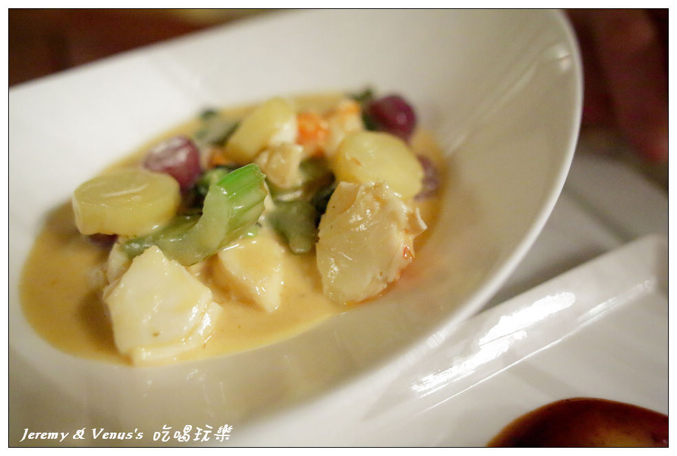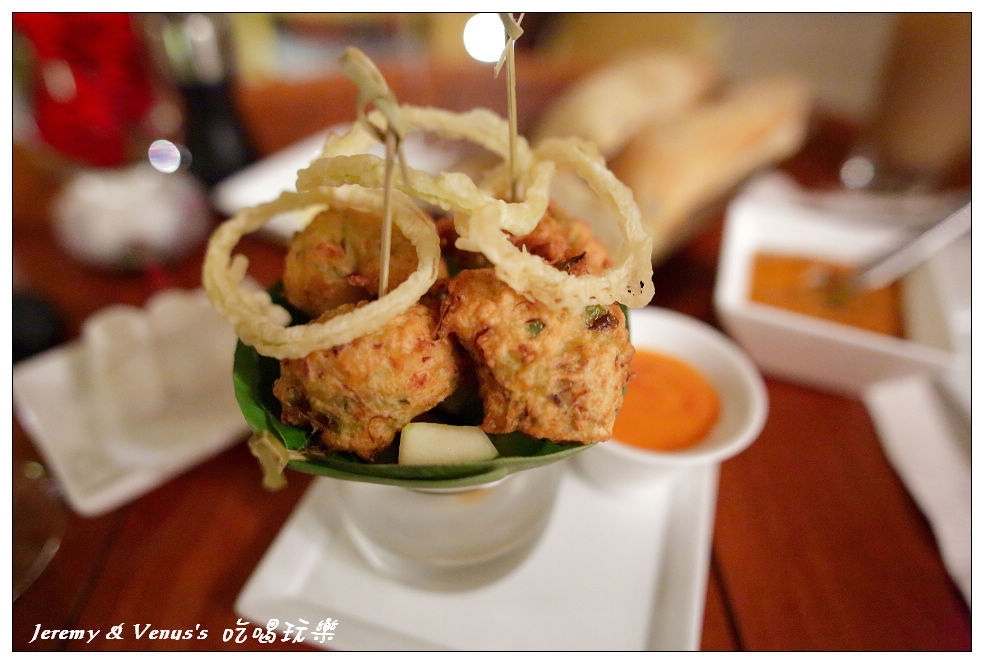 前菜:crab beignets, pepper & mango salsa,就是炸螃蟹沾芒果沙拉醬啦,西方菜單都喜歡連配料都標示出來,讓人看了一清二楚,不像中餐菜單會讓西方人看不懂,螞蟻上樹???