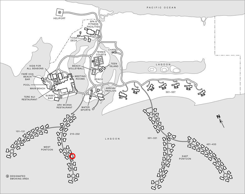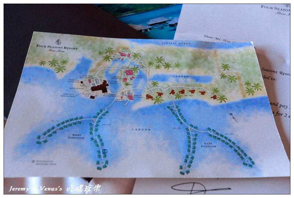 就讓我們來看看四季Four Seasons Resort Bora Bora,潟湖景觀水上屋Lagoon View OverWater Bungalow的房間吧,四季的水上屋有四種房型,最好最貴的是有pool的水上屋,房間也比較大,價格則是其他水上屋的兩倍以上,那不是我們能看能碰的,就不多說了,其餘的水上屋分為Mountain View最貴、Lagoon View其次、Beach View最便宜,然而房間格局大小完全一樣,是以所在位置及面山與否來做區別,我們的考量是Beach View離岸邊太近不喜歡,Mountain View住四晚比住Lagoon View要多花一萬五,因此折衷考量住Lagoon View就好,下圖紅色圈圈就是我們的房間,感謝Irwin特地幫我們選了這一間,因為如果是另一邊的水上屋,要走到餐廳泳池等公共設施要花很久的時間,每次都叫車又很麻煩,因此WEST PONTOON的水上屋比較方便,再者,我們房間旁邊有一小間公設,裡頭有洗衣機、烘衣機與製冰機,就在我們房間旁邊,真的是有夠方便,衣服每天都可以洗,喝飲料時還可以拿著冰桶去裝冰塊,這房間選的真好。