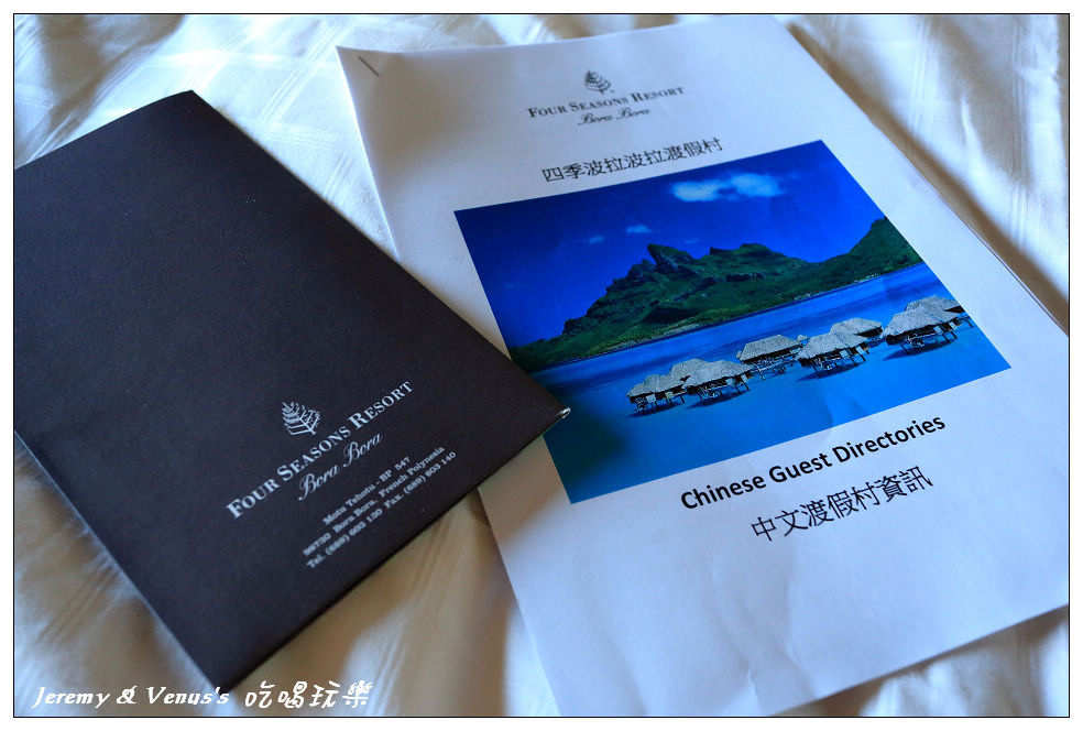 我出國旅遊的最終夢想終於實現了(目前吧,往後可能還有其他夢想),從離開家門到抵達四季飯店,整整花了24小時的時間,在船上看到四季的水上屋後,接著就看到飯店人員站在碼頭邊迎接我們的到來,遠遠就看到咱們Bora Bora眾多飯店裡唯一的當家華語接待專員Irwin,因為在台灣出發前有跟他聯繫過,所以就由他來幫我們做介紹並辦理CHECK IN事宜,上岸後飯店人員先送上冰毛巾與迎賓飲料消消暑,接著就由Irwin開著高爾夫球車載我們到房間去,其實才中午12點多,還沒到進房時間,不過房間已準備好,四季也不可能讓客人等待,所以就讓我們提早進房,如果客人到了卻還無法進房,四季也會招待客人吃點輕食,畢竟四季的服務是非常周到的。到國外能用自己的語言來溝通真的是很方便,沿路上Irwin跟我們介紹四季的環境,到房間後直接在房間裡辦理登記填寫事宜,並幫我們確認其他行程,請原諒我的英文只有國中程度,如果真要我用英文溝通,那可真的是頭大了,還好有Irwin在,省了不少麻煩。