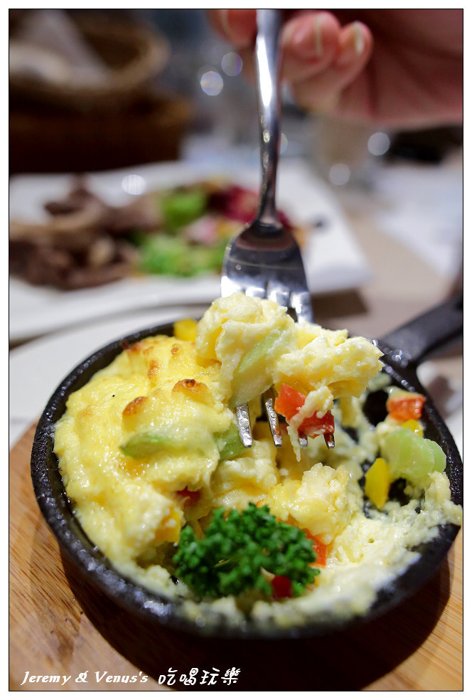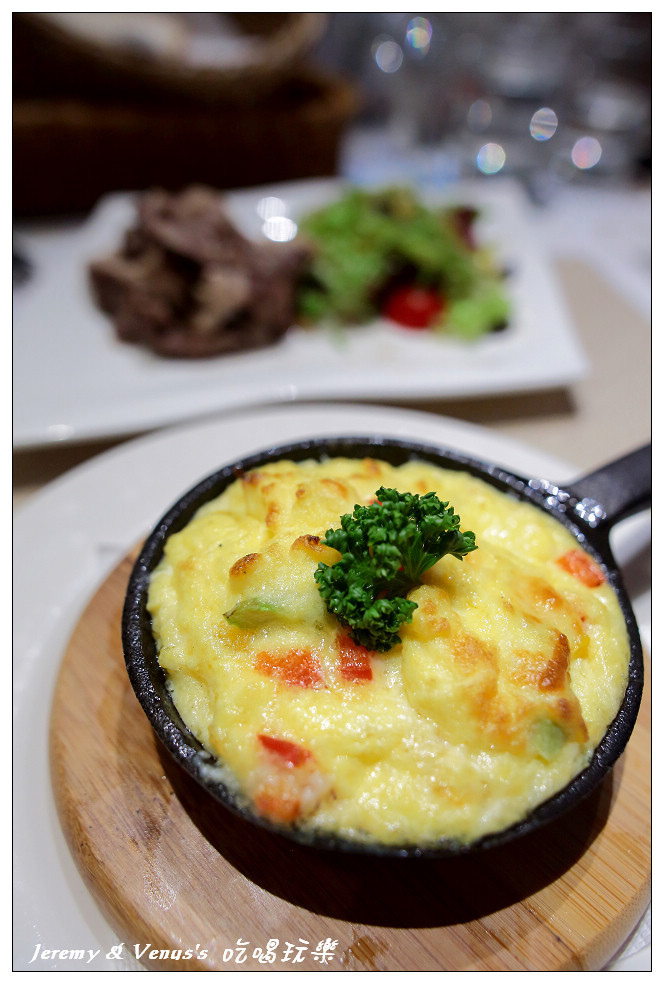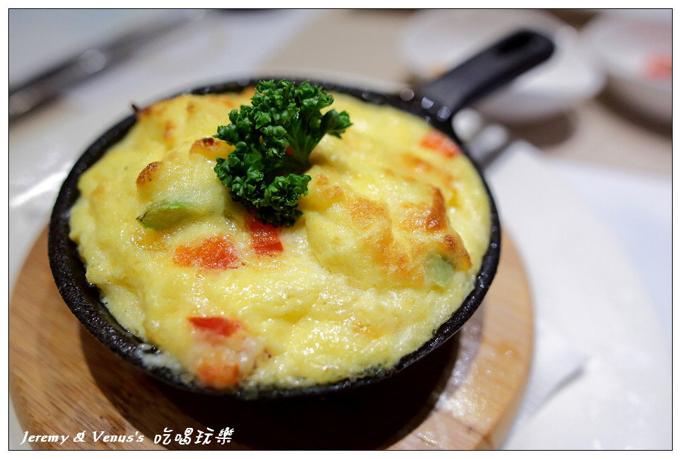 我在馬德里吃過正港西班牙烘蛋,不過這裡的可說是改良版的西班牙烘蛋,加入法式料理的元素,作法我幫大家打聽到了,就是將蛋汁跟起士、奶油充分攪拌,加入炒過的紅黃椒,將蛋汁下鍋至半熟後,裝進容器裡再進烤箱去烤過,置於時間的拿捏則是秘密...........不然大廚給你當就好了啊~