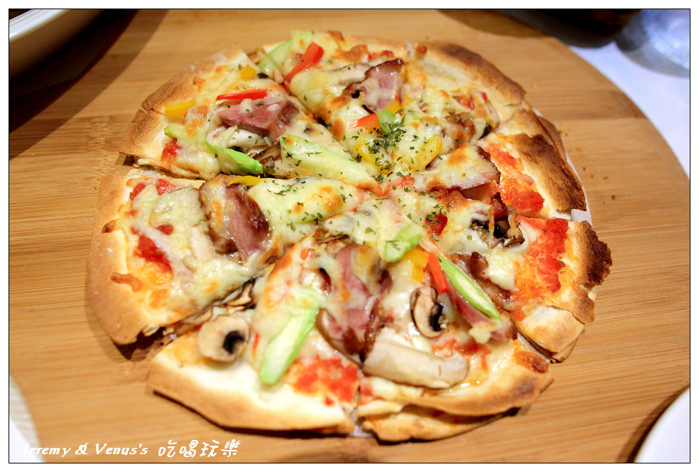 少見的獨特披薩口味,用料豐富,除了主角鴨胸肉之外,其他佐料甚多,也有用酒來增加香氣
