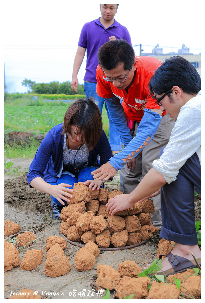 甘藷達人~松哥先示範過堆土窯的方式後,就由我們日本及俄羅斯的學生親自來體驗看看,這是日本組,將土塊堆放在已安置好的鐵環上方成窯狀,金山區公所及農會為了方便遊客,早在兩個禮拜前,將泥土攪和水,捏成土塊日曬、裝箱、儲存,以供民眾使用,這樣民眾就能很快的堆置成窯。(謎之音:以前哪有那麼好?都得自己去找尋石塊土塊來堆)