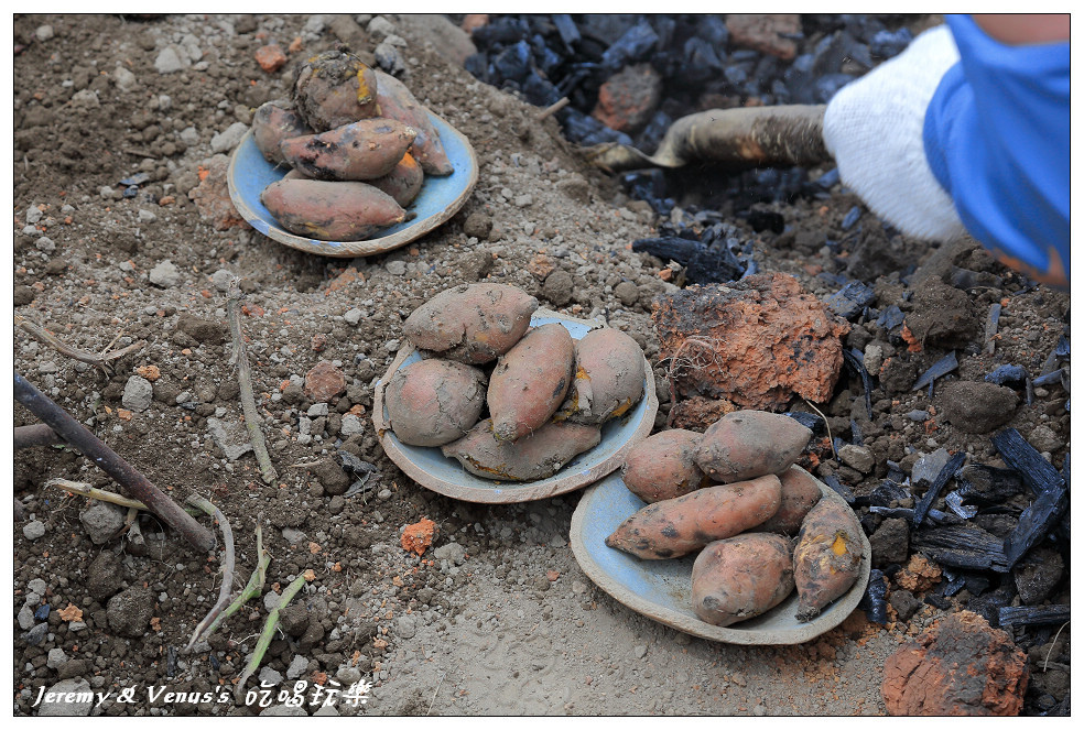 開挖時要輕輕的,燜熟了的甘藷是很軟的,太用力剷會把甘藷弄碎的,用剷子輕挖翻動,看到甘藷就用夾子或手直接拿起來(燙啊)