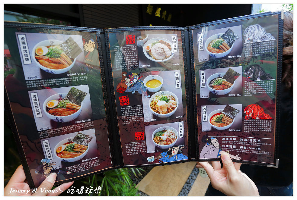 拉麵菜單,主要分三類,先看看右邊,右邊有白虎、黑虎、赤虎拉麵三種,就是一般的拉麵,附筍乾及一片叉燒肉而已,白虎就是白湯,黑虎是加了墨魚醬汁的湯頭,赤虎當然就是辣味的。再來看左邊,拉麵名稱前多了虎嘯兩字,比一般拉麵多了一片叉燒肉及半顆糖心蛋,就要多40元。最後看中間,虎嘯沾麵也是這裡的招牌,光看內容就比三田好多了,另外還有咖哩沾麵及拉麵,價格可不便宜啊260~300元,跟山頭火差不多,稍微大碗一點,重點是麵屋武藏不收服務費,這點就大勝了。另外也有許多日式小菜及飲料。