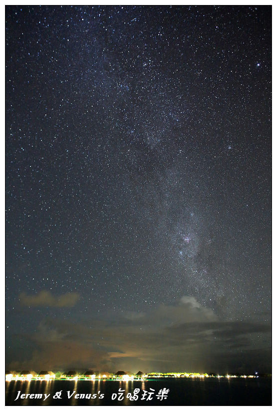 晚間,隨意吃些早餐打包的麵包以及餅乾之類來裹腹之後(泣~~這是來天堂得付出的代價,摳摳花光了,沒辦法),看到今晚的天空還不錯,銀河肉眼可見,跑去水上屋陽台拍了幾張都不滿意,沒有景可帶又會晃,於是決定到泳池前的沙灘拍,可以拍到整個山景的星軌。