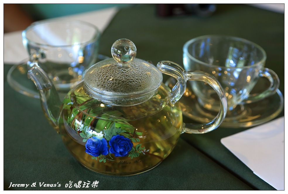 先端上一壺現泡香草茶給大家飲用,不同於其他香草茶店家都是以乾燥花泡製,準園提供現採新鮮香草來泡茶,香味絕佳,透明茶具,新鮮看的到。