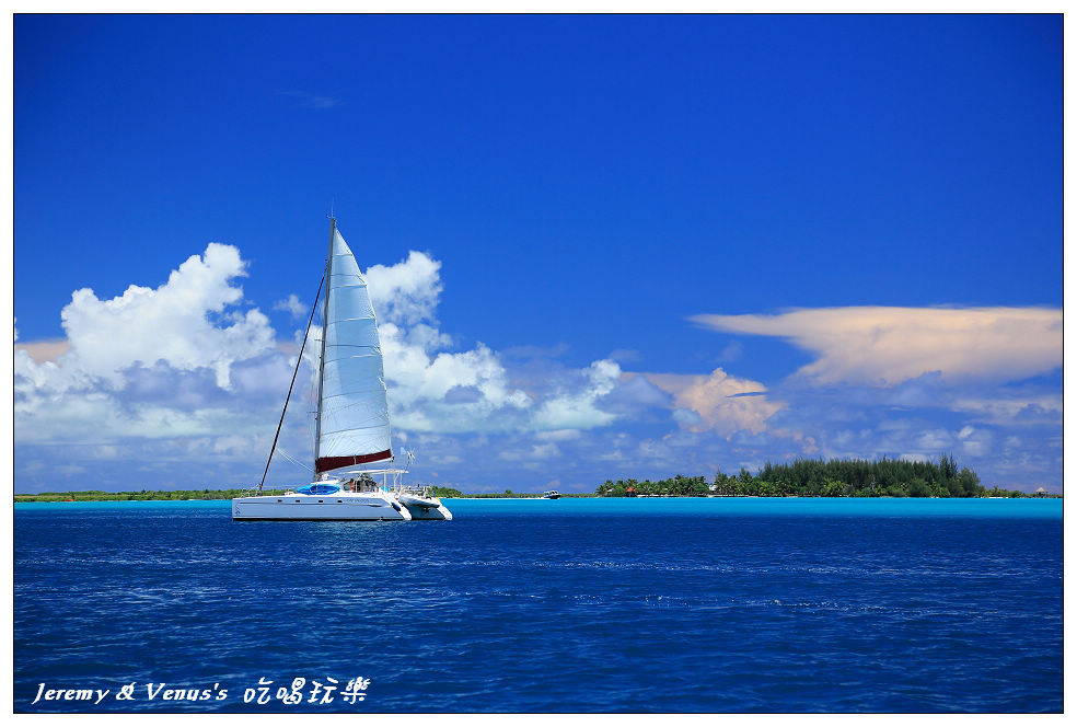 有錢人的豪華動力風帆,大溪地的海就是出了名的漸層藍,從岸邊到深海,同樣是藍色卻有多種不同的深淺,比起馬爾地夫更具多變化性