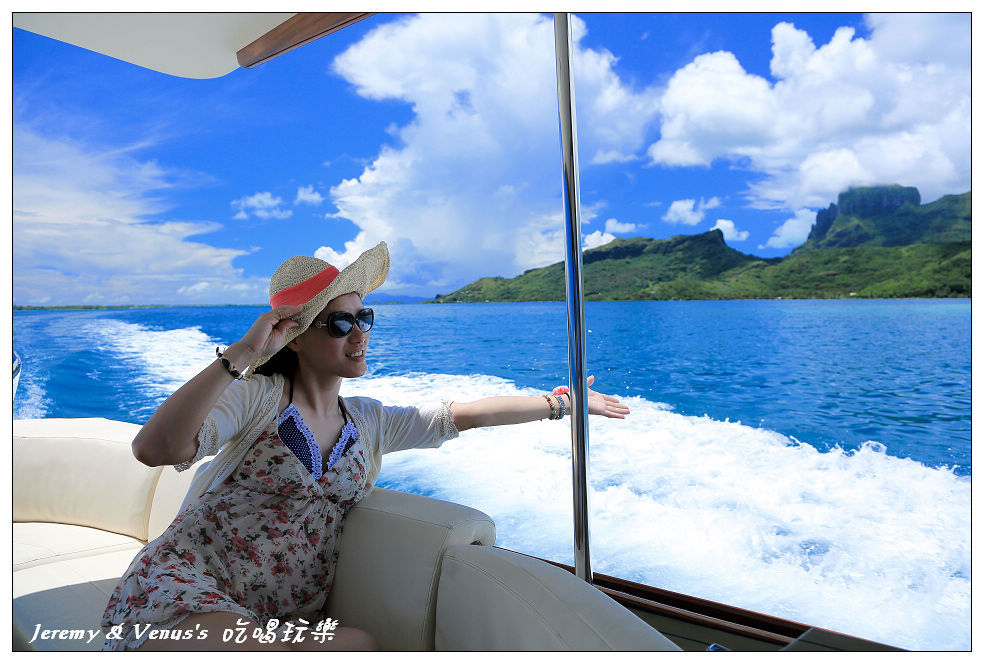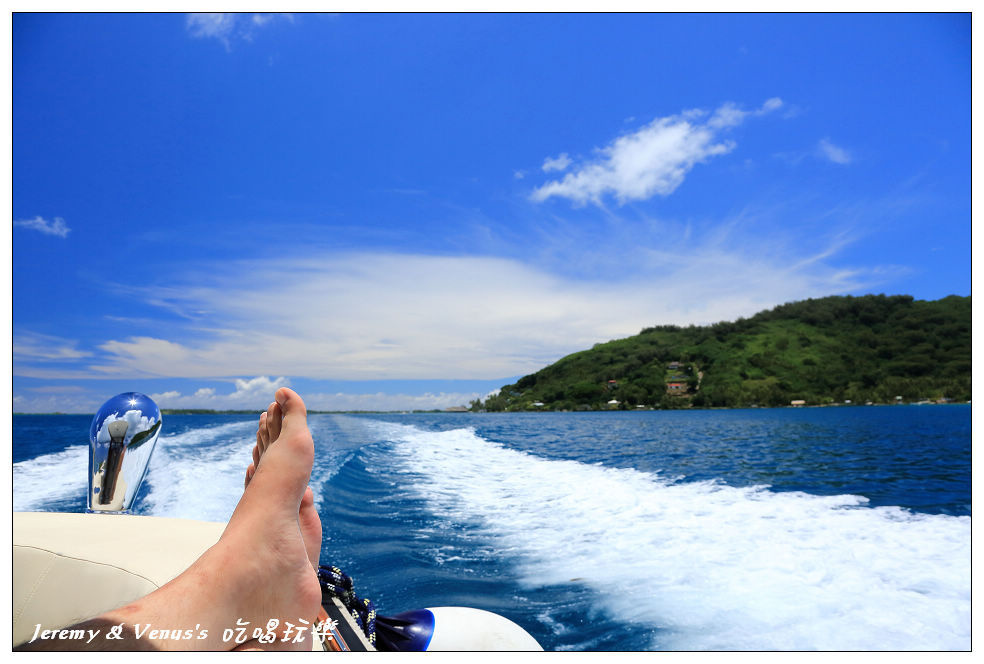 承上上一個日出篇,當我們在房間陽台上,一邊欣賞著那一片踢昏你藍的美麗海景,一邊悠閒的享用完獨木舟早餐後,中午我們打算去Bora Bora本島逛逛,四季飯店每天中午11:15分有固定的免費船班前往Bora Bora本島,約20分鐘抵達,14:45再從本島發船回四季,所以大約有三小時的時間可以去本島逛逛買東西。因此,早餐後跑去泳池晃晃,再去商務中心上個網(四季房間上網是要收費的),發船的時間一到,我們就準時坐在船上準備出發了~