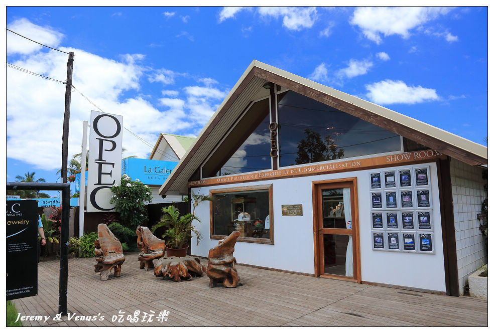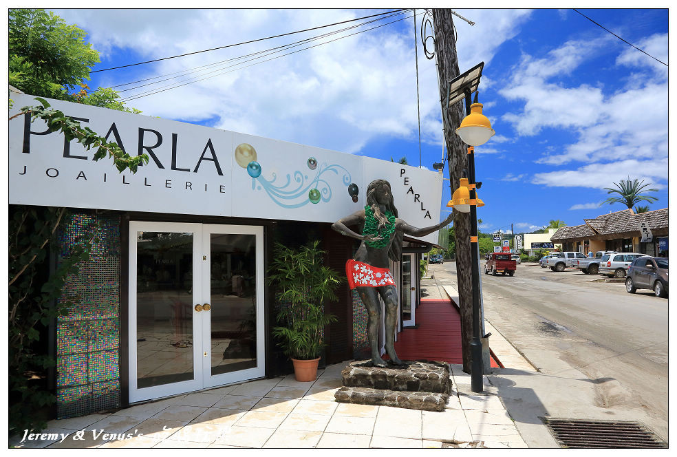 到了岸上,飯店人員交代下午兩點半以後要回碼頭集合,其實就算你沒出現,他們也會把本島翻遍,直到找到你為止,拿著出發前Irwin給的Bora Bora本島地圖,到處去逛逛,不過說真的,其實能逛的地方不大,走一圈大概半小時就沒了,除非你購物能力很強,每個店家都進去看看殺價購買,不然也沒啥好逛的,照片上就是大溪地最主要的特產~黑珍珠~商店