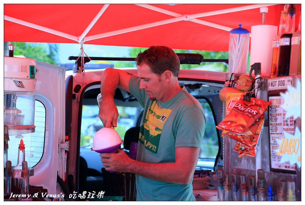 是因為老闆太帥才來捧場的嗎?留個小鬍子還頗性格的,彩虹冰在夏威夷頗盛行,主要就是在挫冰上頭淋上五顏六色各種口味的果汁糖漿