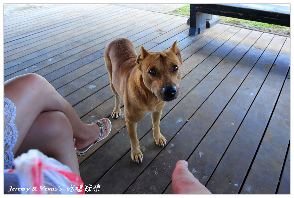 拎著超市買的冰涼可樂,還有台灣帶來的豆乾、餅乾,在碼頭旁坐著休息,不過......有雙銳利的眼光一直盯著我