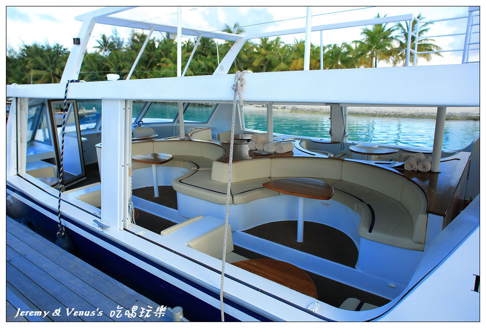 不過在看照片之前還是得先對整個度假村的地圖要有個概念先,主要有兩個水上屋區,以及岸邊的公共設施區,右邊的岸邊是獨棟多房間有私人泳池的VILLA,連屋前的沙灘都是該房客專屬,當然價格不是我們一般人能想像的,當時有中國家庭住那邊,可見其消費能力驚人,而左邊的公設主要是沙灘、泳池及三間餐廳,後方則是SPA區,中間則挖鑿了兩個人工潟湖