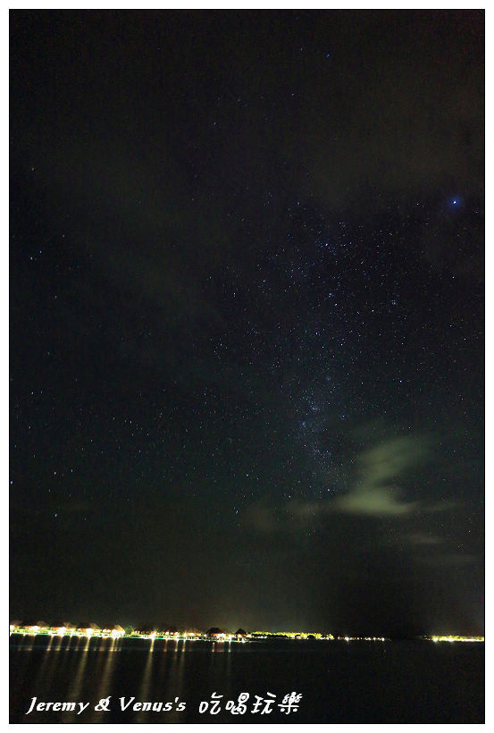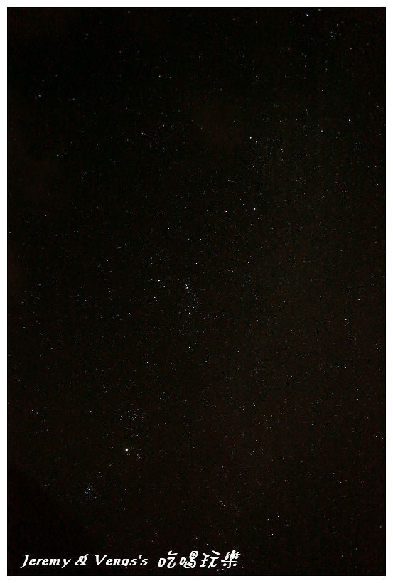 晚上雖然想睡,可是我還是很盡責的到陽台上來拍星星,滿天星斗,看的到正中央的獵戶座嗎?以及左下方最亮的天狼星