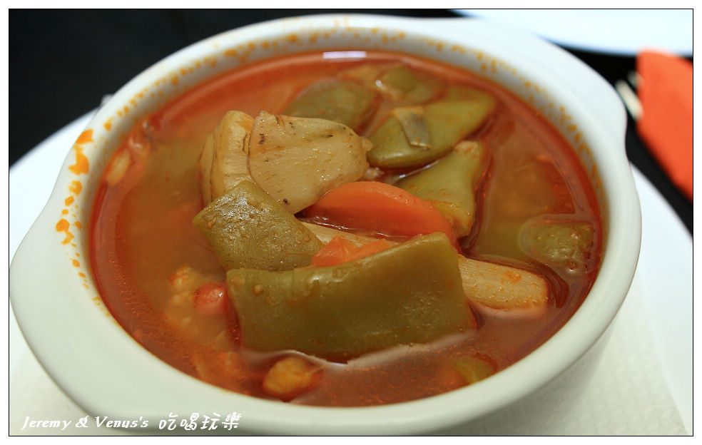 這個湯,西方常喝的燉蔬菜湯,裡頭的豆莢好硬,根本吃不下去,把湯喝掉就好