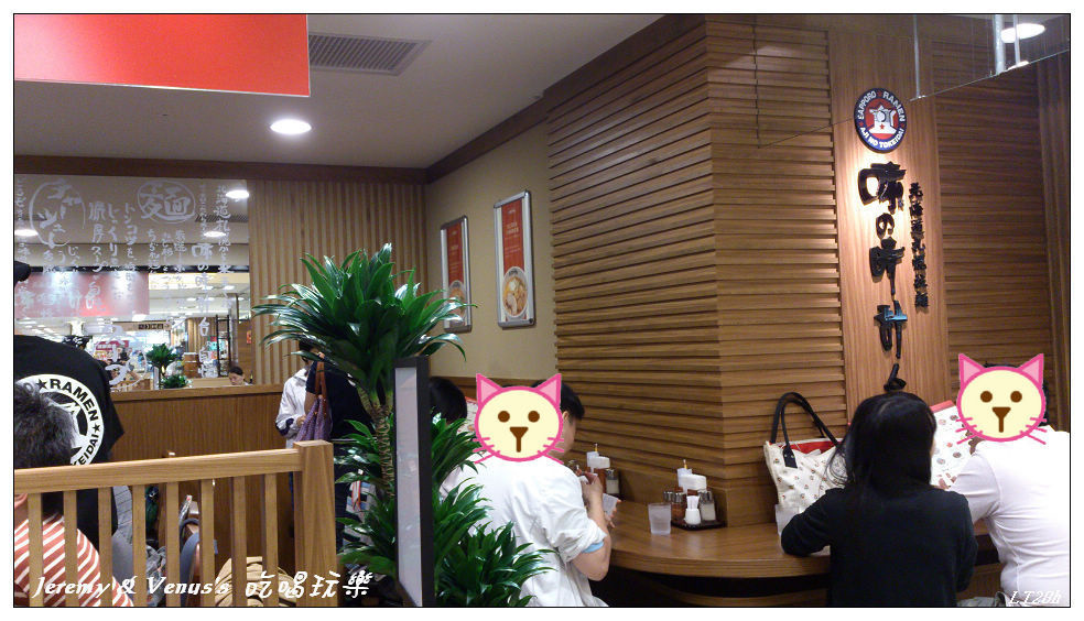 那排隊人潮都是要去衝週年慶的特價商品的,跟我們沒關係,我們直接往地下二樓走去,ㄜ......店裡坐滿了,裡面只有5張兩人桌以及56位吧檯位,大概只能坐16人,不過好處是可以坐外頭美食區的座位,我們就直接坐店門口美食區的位子。店家依來店先後順序先發了號碼牌給我們,我們拿到19、20號,做什麼用的啊?