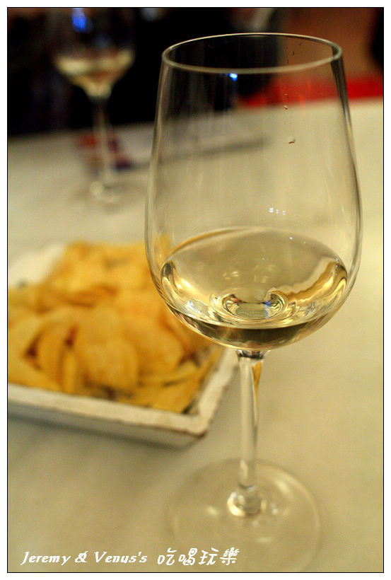一人兩杯酒,一杯甜的,另一杯較不甜,桌上還有一大盤洋芋片,嗯..........我也喝不出什麼道理來,反正咕嚕咕嚕倒下肚就對了