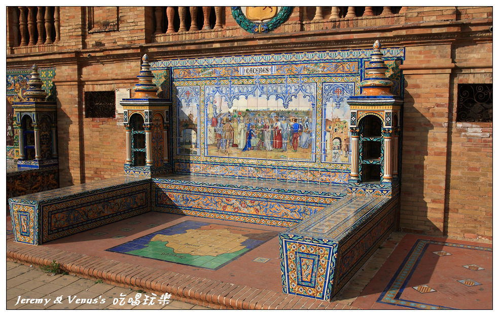 佔地為一個直徑200公尺大的圓形廣場,周圍有很多這種很有特色的壁龕,都是用磁磚連貼而成,呈現的圖案是西班牙境內各個城市的特色及地圖,每個都不一樣