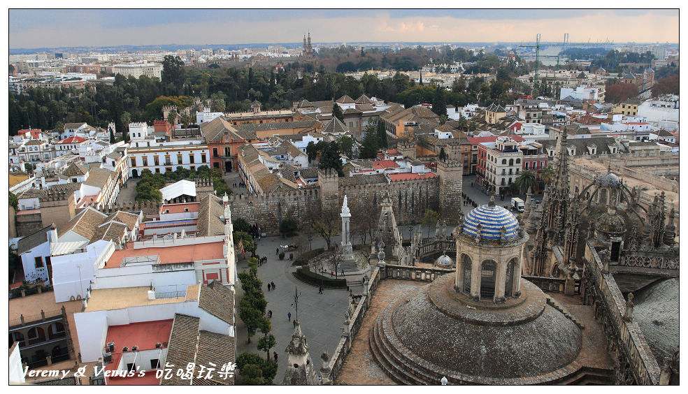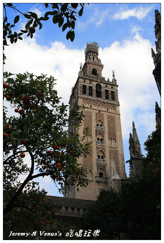 這是一旁的希拉達塔,可以爬上去俯瞰整個塞維亞街景,不過要爬上去可不容易,塔的外圍有螺旋走道可以一路爬上去,總共要爬34層樓,還好是斜坡不是階梯,慢慢走大家都是可以爬上去的,說是34層樓,但以現在建築來看,高度大約一半17~20樓高吧