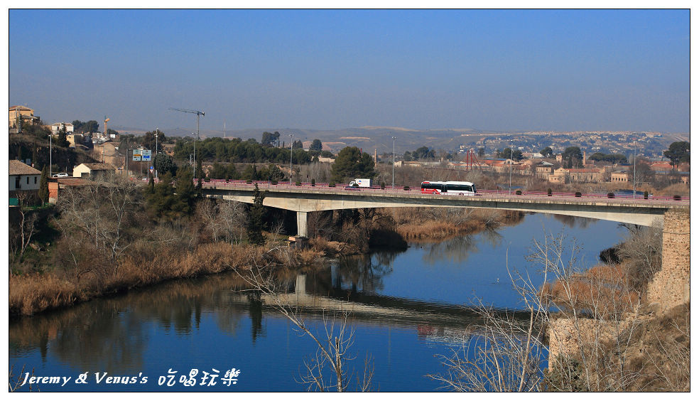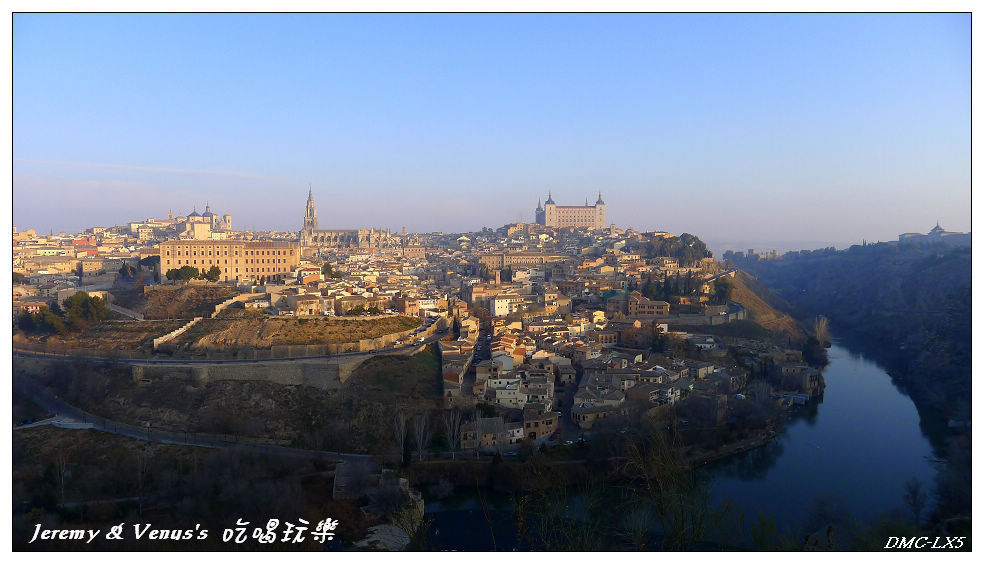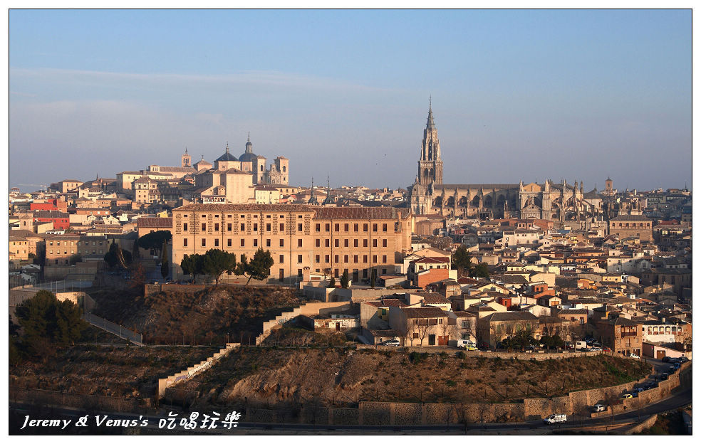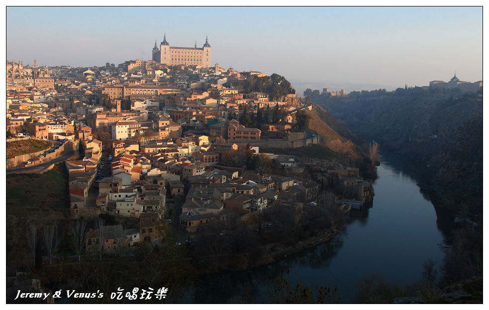 車子由昨晚住宿的飯店出發,一下來就到了這處眺望托雷多古城的最佳地點,在這裡可以看到整個被太加斯河(Rio Tajo)圍繞托雷多古城的全貌,照片上最明顯的建築是阿卡乍堡(西班牙到處都有阿卡乍堡),現在是軍事博物館
