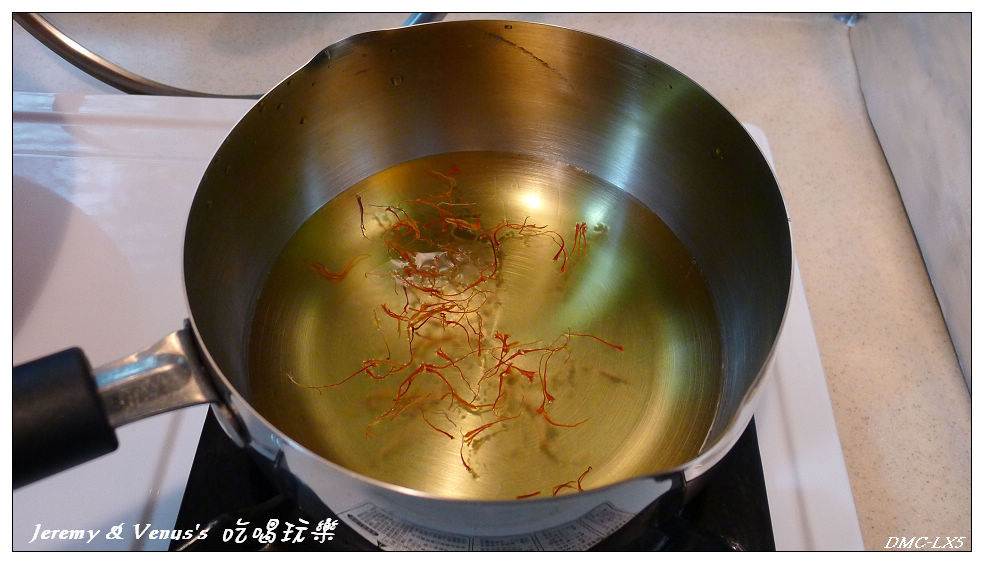 先將番紅花水煮熱,不要全滾,水熱了就好