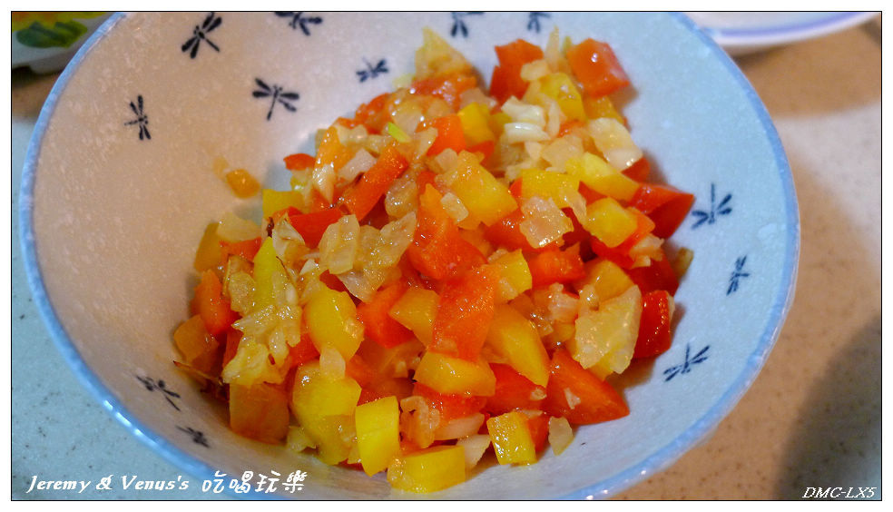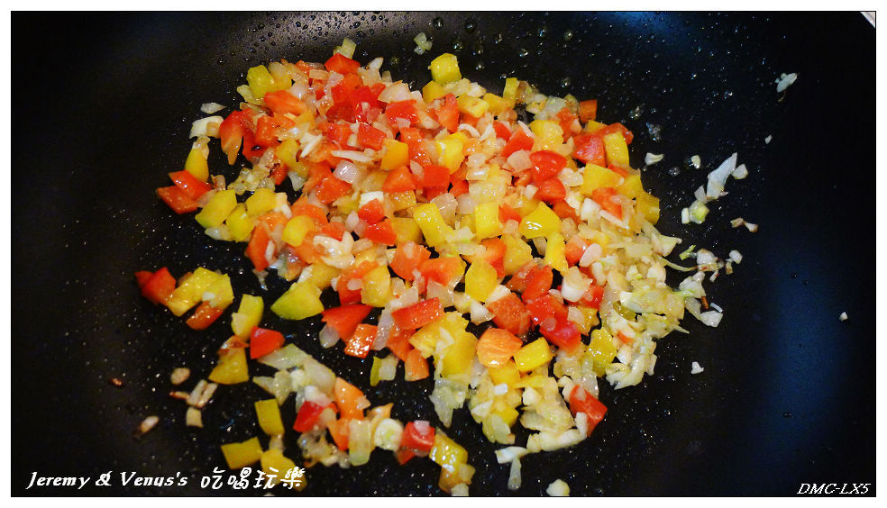 先下橄欖油炒洋蔥、蒜末、紅椒、黃椒