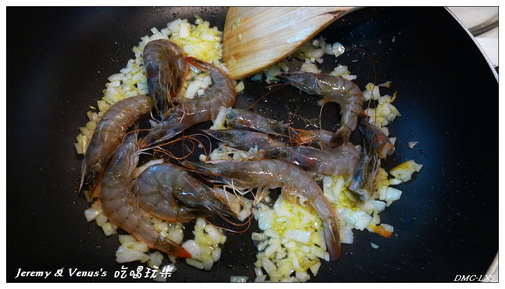 為什麼蝦子不用燙的呢?因為蝦子炒過香氣會比燙過還要香,蝦頭裡的蝦膏盡量擠出來,之後把蝦子夾起來