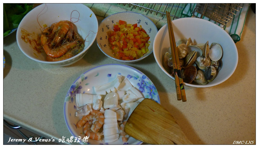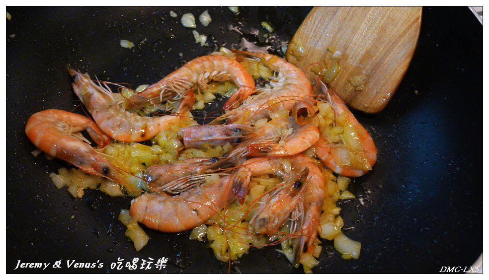 就我所知,西班牙米跟台灣或日本米不同,台灣米煮久了會糊,而西班牙米不會,也可以用義大利米,不過我家就只有台灣米,煮久了一定會變成濕濕軟軟的燉飯,所以我只好就把它當燉飯煮了。再來,西班牙海鮮飯不應該用洋蔥,因為洋蔥會使米軟化的更快,不過我已經沒有這方面的煩惱了,反正都已經用台灣米做燉飯了,就加些洋蔥末吧。還有,西班牙人應該還有加一些辛香料進去才對,不過我家沒那種東西,也不知道是什麼,所以我也沒加香料,總和以上結論,最後我煮出來的還是台灣口味的海鮮燉飯而已,海鮮味很重倒是不錯啦~