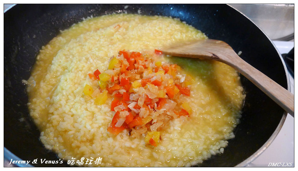 等到米心熟了就加入剛剛炒過的紅黃椒