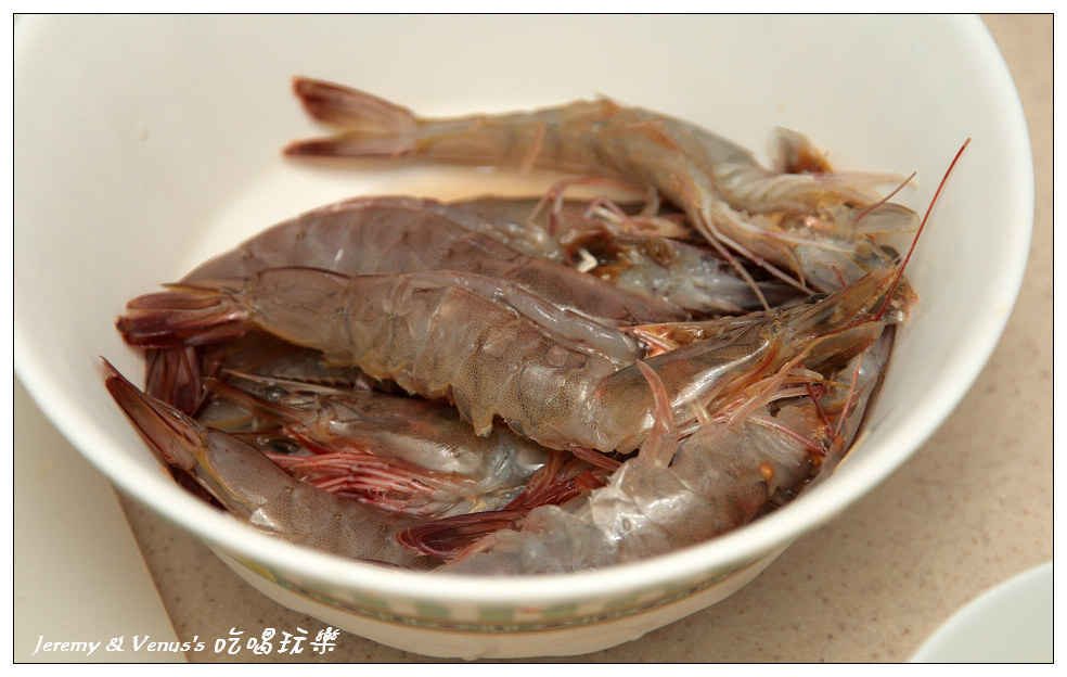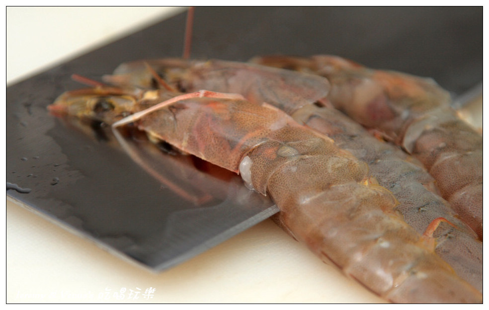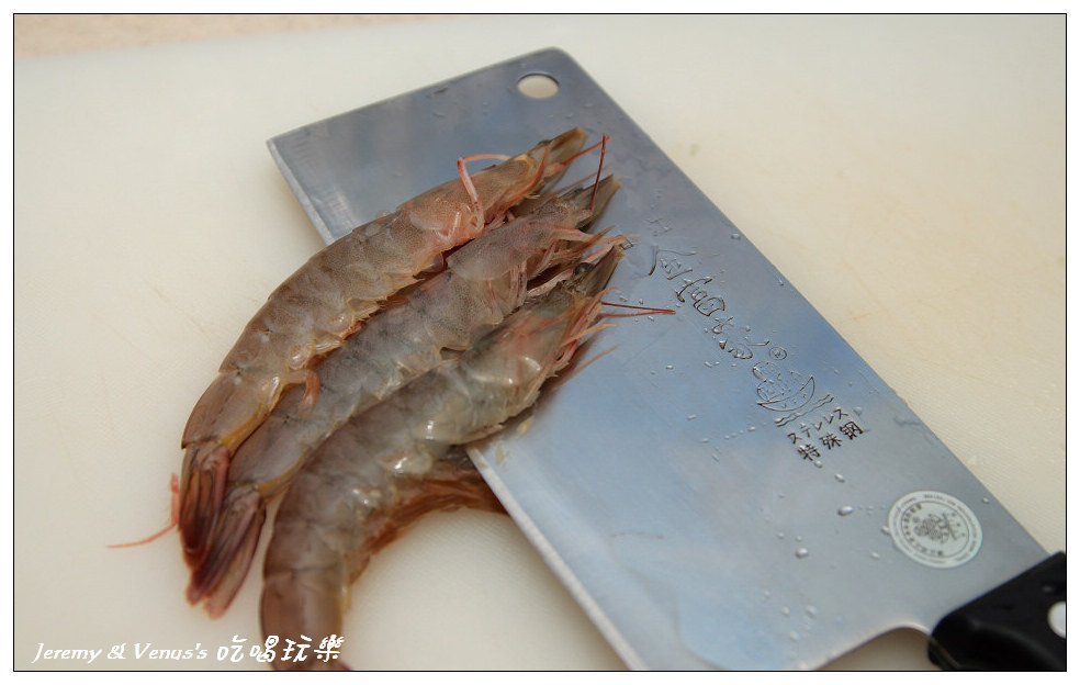 先來處理蝦子吧,當然想吃好一點的就用龍蝦吧,不然退一步用大明蝦,不過像我們只能去菜市場買,就買普通的蝦子來用就好,從蝦頭直接剖開