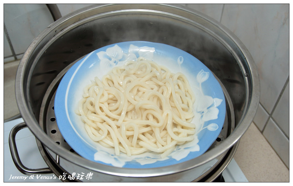 當天冰箱裡還有一包烏龍麵,於是就用烏龍麵來代替板條,但是烏龍麵比較粗硬,不好吸收醬汁,吃過以後還是覺得板條或粿仔比較好,不然就用豆腐吧,將板條平鋪在盤子裡下去蒸三到五分鐘