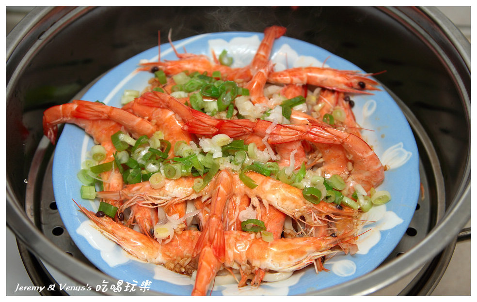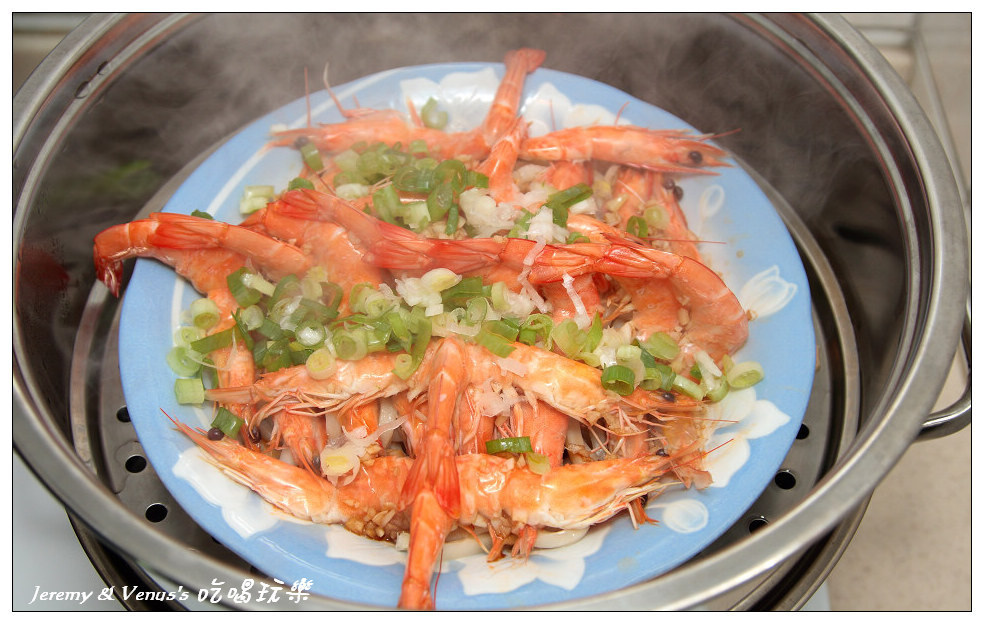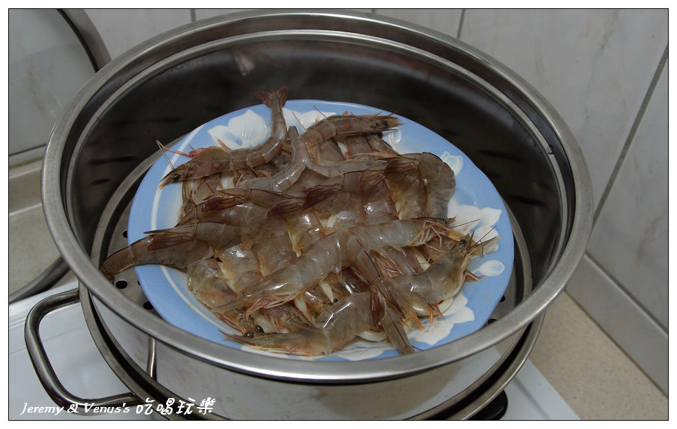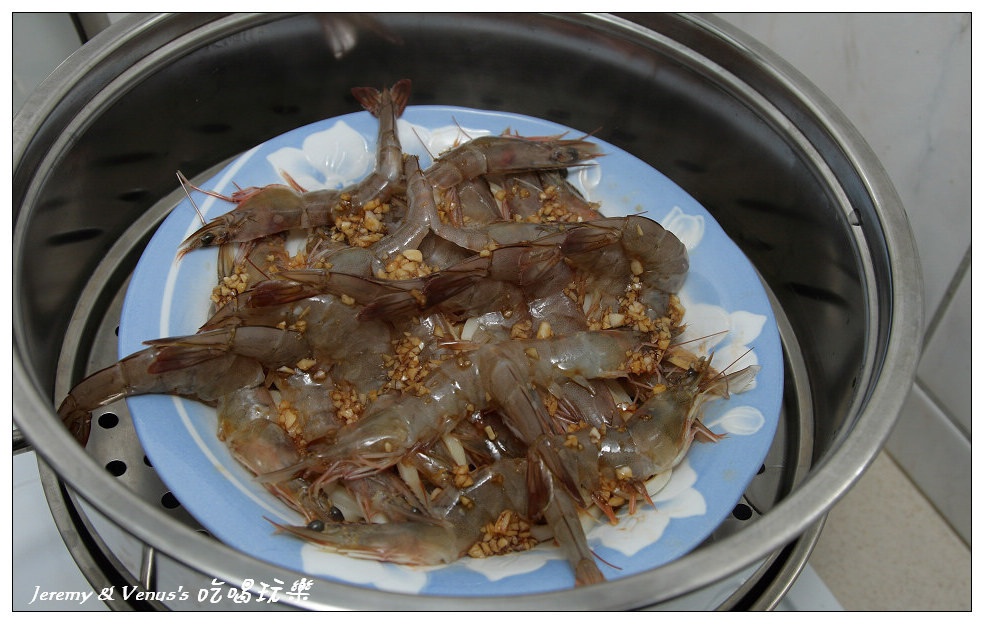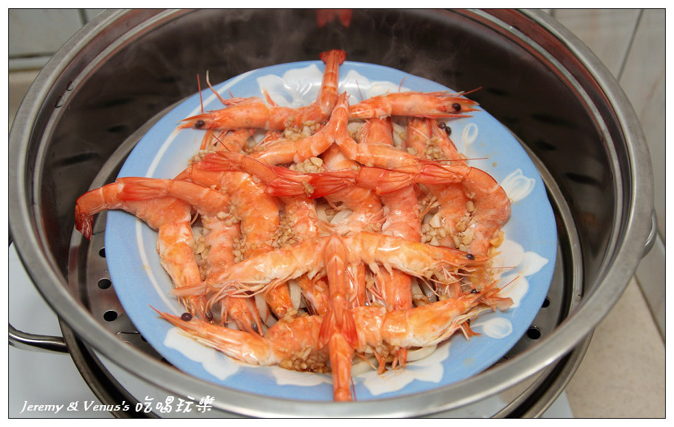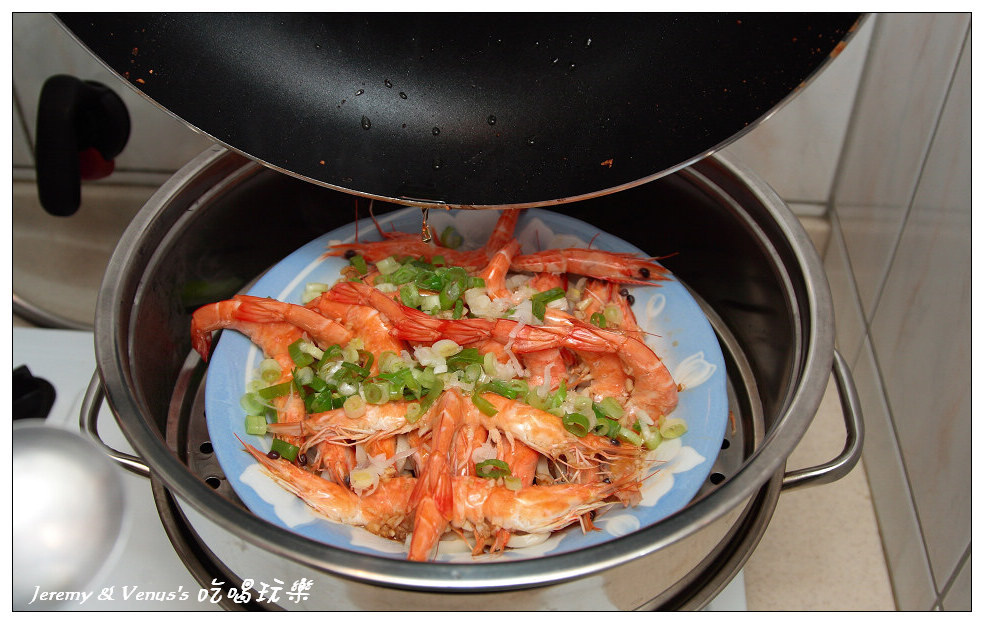 然後把調好的醬汁均勻的淋在蝦子上頭,蓋上鍋子繼續蒸