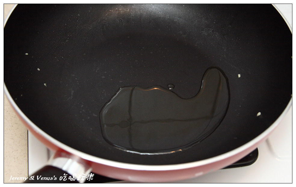 另起一個鍋來熱油,倒入些許沙拉油及香油各半加熱等等要搶油用的,這時要小心別讓水滴進去,否則會產生油爆,拿一支擦乾的湯匙備用