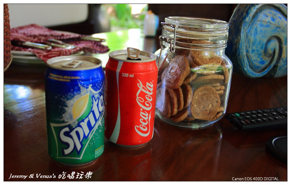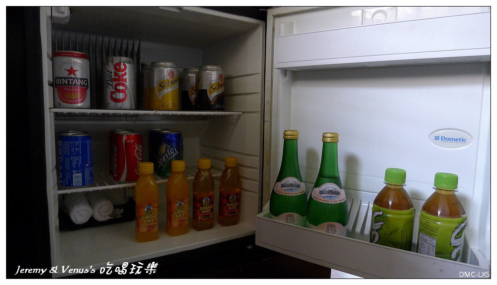 電視下面是冰箱,冰箱裡頭擺滿了飲料,有啤酒、可樂、雪碧、果汁、茶、運動飲料、蘇打水、礦泉水等等,重點是~通通不用錢,任你喝,每天都會補滿!