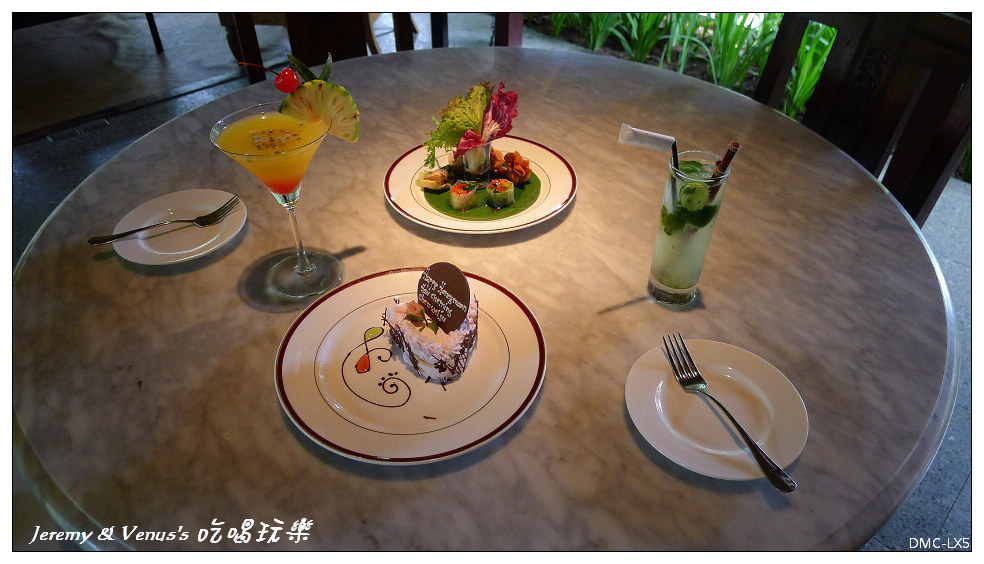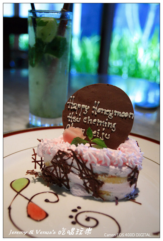 兩杯迎賓飲料、一盤點心,一份蜜月蛋糕