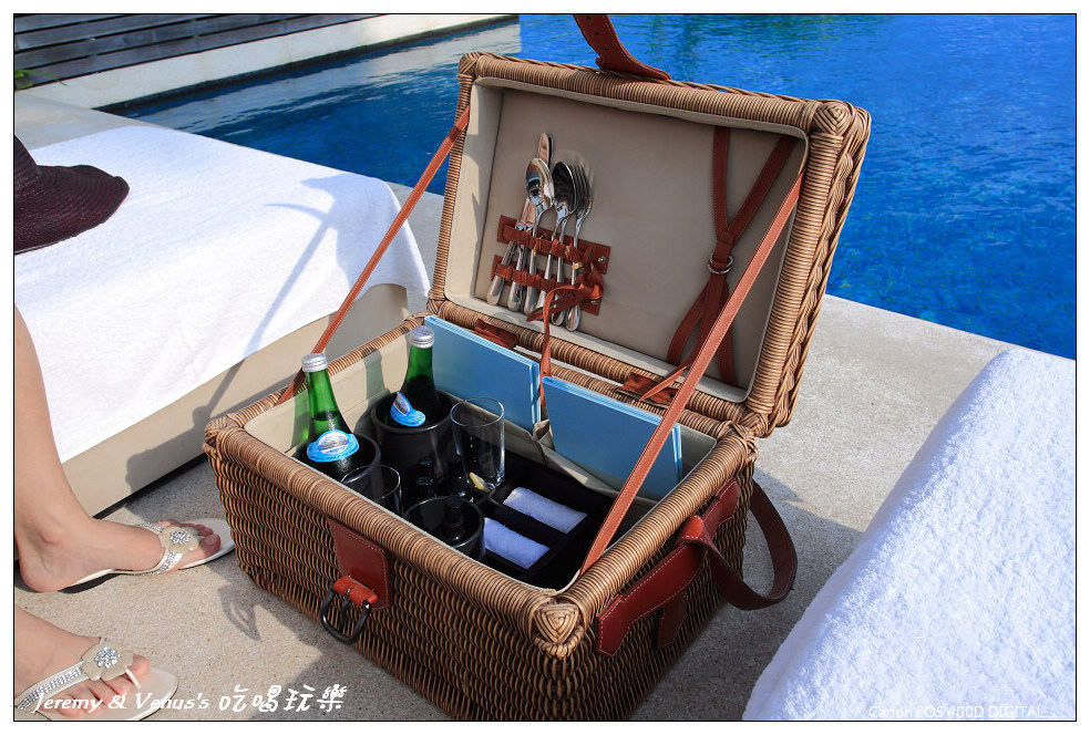 不久後,服務生便背來一個籃子,裡面是這個,有餐具、MENU、冰涼的礦泉水、冰鎮過的杯子裡頭還有檸檬片、冰毛巾、還有Alila的防曬組合,有防曬油、乳液、曬後冰鎮噴霧等等的