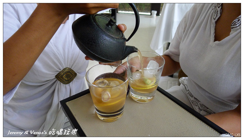 就坐後先端上一杯泡有檸檬片以及檸檬草的冰茶