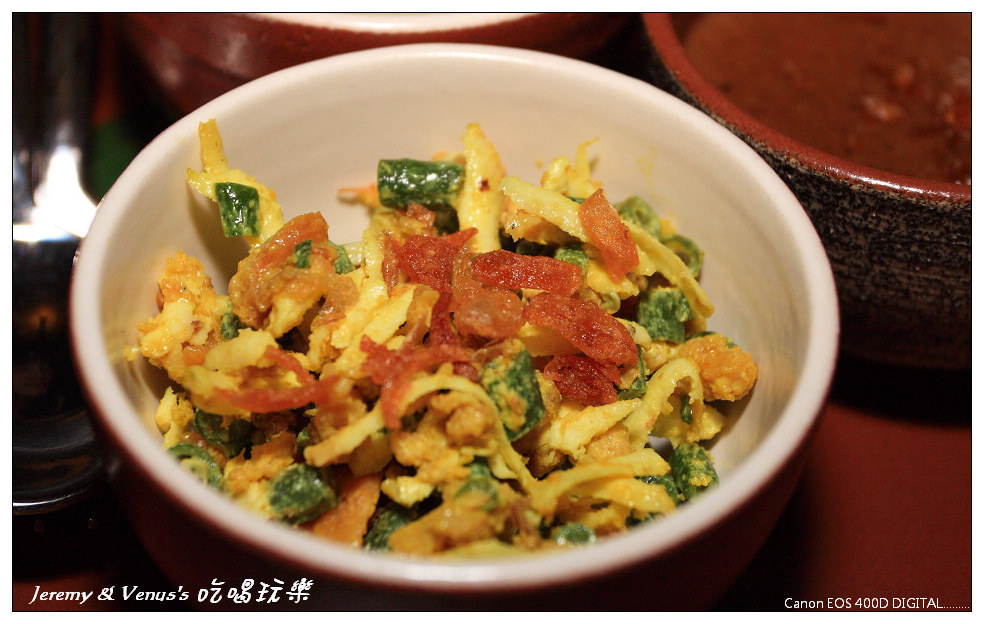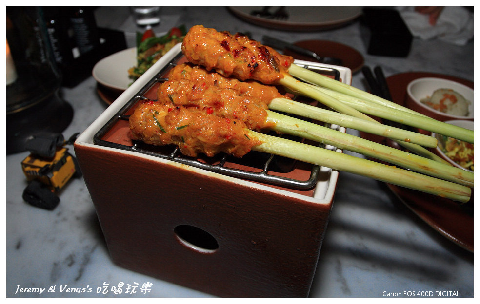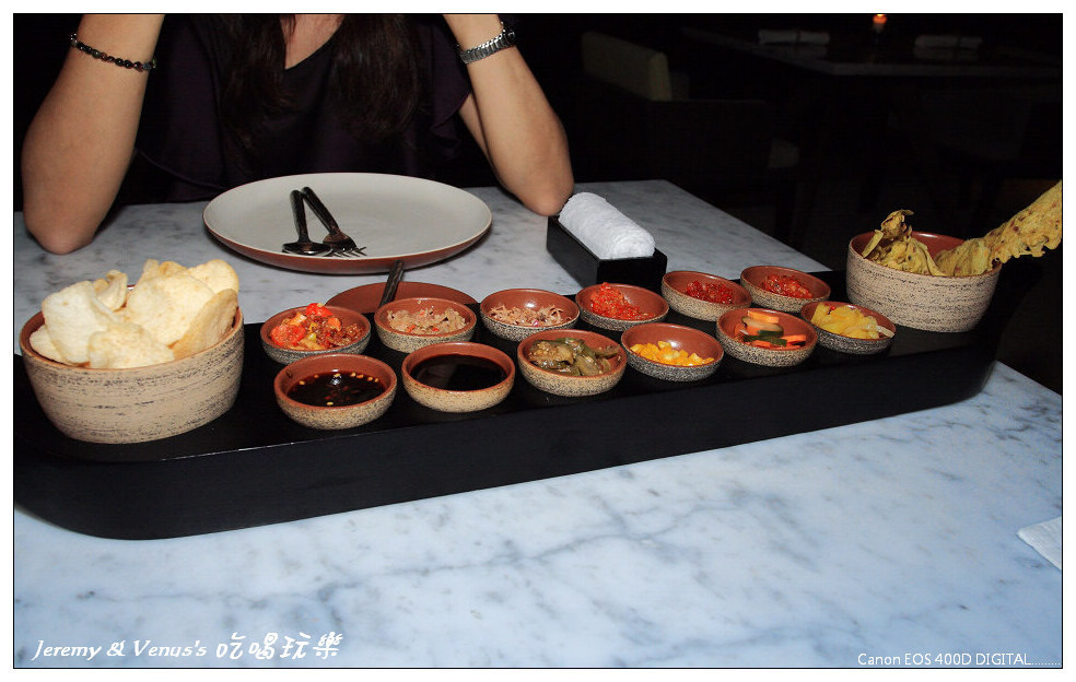 傍晚在大鳥巢看完夕陽後,回房間稍做休息,然後再去飯店理的餐廳用餐,因為我們是純自助,沒有導遊沒有司機,所以沒辦法到處跑,因此晚餐只好在飯店內解決。Alila Villas Uluwatu有兩間餐廳,一個是西式Western cooking methods,另一個則是巴里島當地風味餐廳,因此我們選擇吃巴里島風的菜,在滿滿都是豆芽英文字的菜單裡,我們實在很難選擇我們要點什麼,然而當你不會點或是不知道怎麼點甚至是完全看不懂菜單時該怎麼辦呢?就是請服務生推薦就好啦,經由服務生的介紹,我們還是聽的懂他推薦的是什麼啦,因此就照他推薦的點了幾樣來吃,同樣的,小鳥胃的我們倆,吃的還是很少,這樣可以省一點,算是好事嗎?
