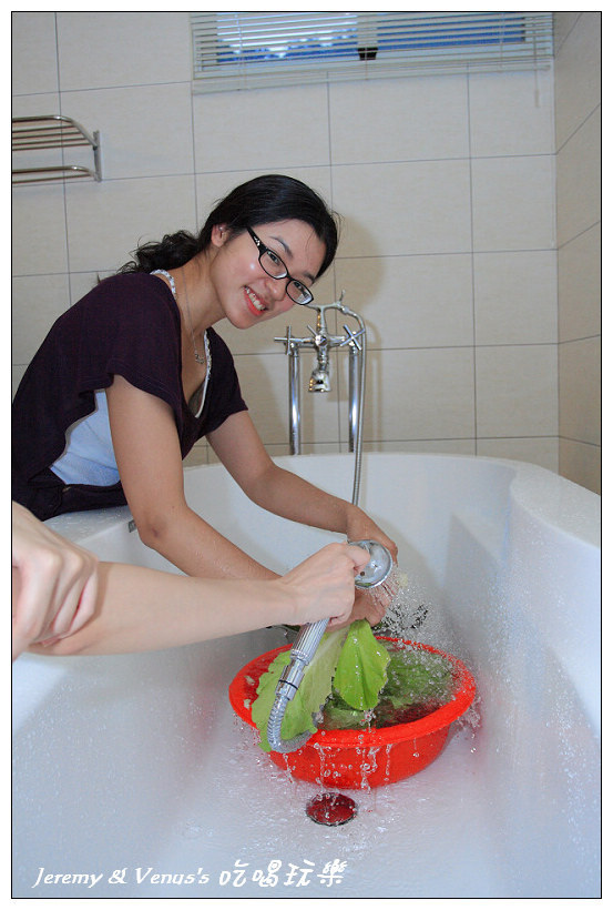準備的食材太多了,處理起來也很費功夫,要切的要洗的要煮的要剝皮的,大家分工合作分頭進行,依潔秋喬很認真的在洗菜.......原來浴缸&蓮蓬頭還有這種功能喔!