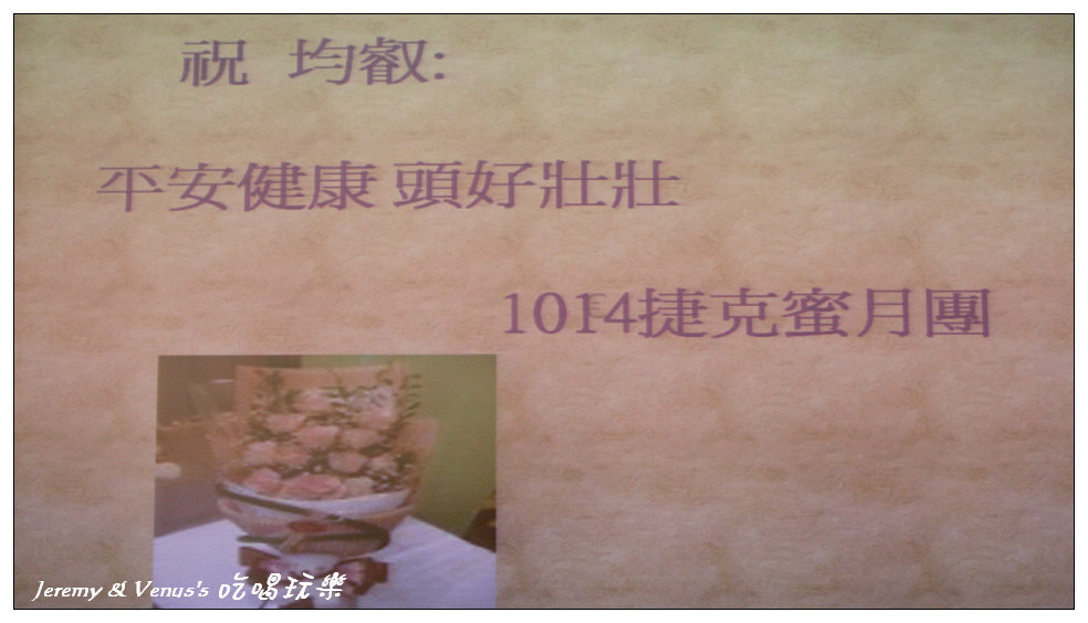 整體上,這次的餐點比上次更讓我滿意,餐廳的服務品質也很好,可以幫客人在牆壁上打投影片字幕,上面照片就是我們請餐廳打上的POWER POINT畫面,在我們包紅包給小叡叡的同時,餐廳還主動送上小禮物及小蛋糕,算是很貼心為客人著想,值得推薦~