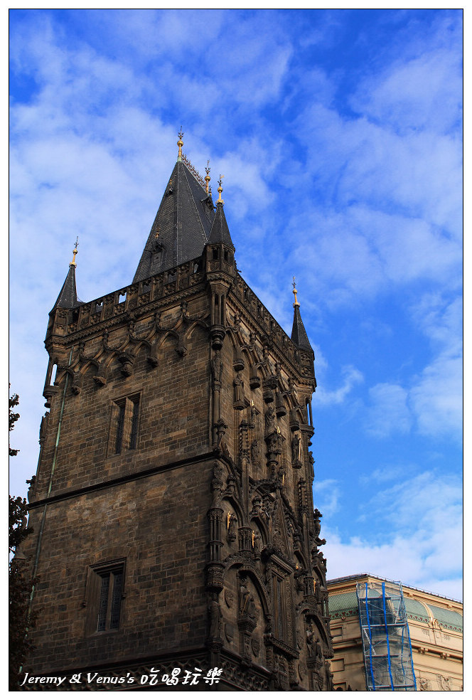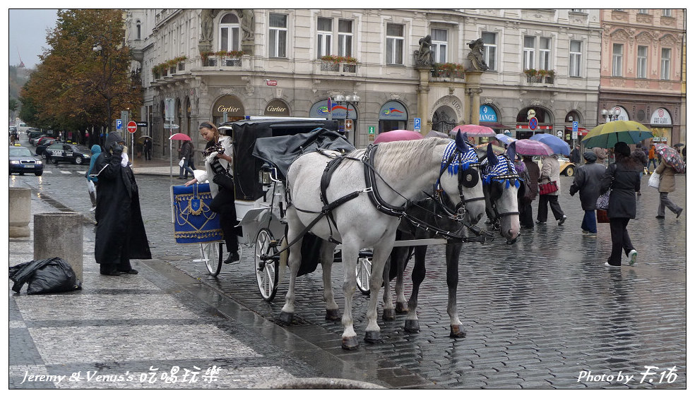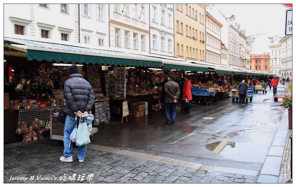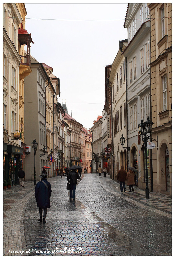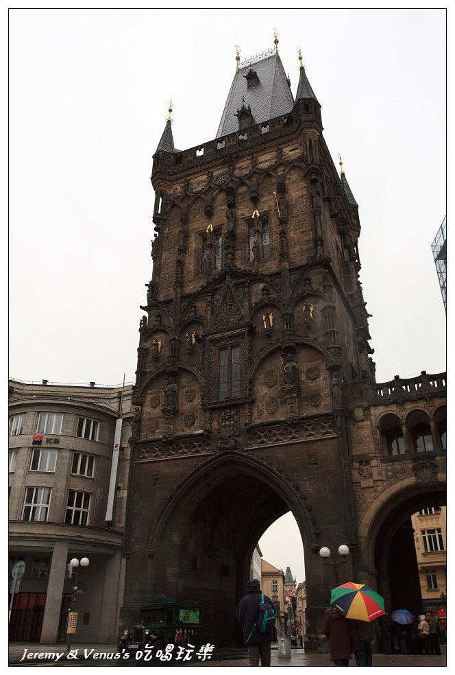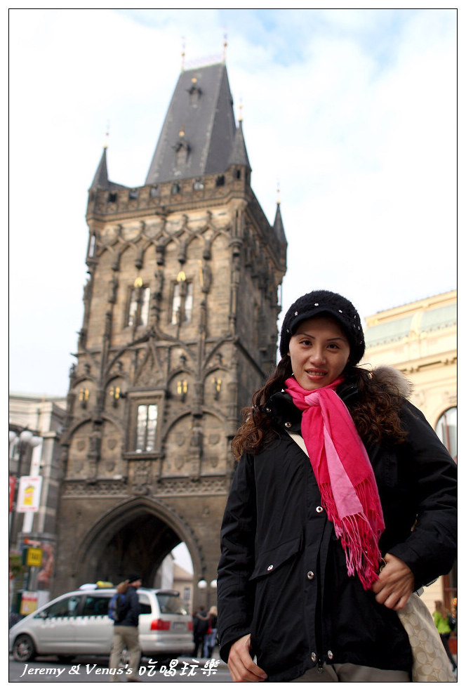 在用完早餐後,九點準時從飯店出發,不過今天上午,天空下著綿綿細雨,我那雨神的封號可不是浪得虛名,即使不下雪,還是會下雨的,真不知道什麼時候我才能擺脫雨神的封號變成陽光男呢?唉,下雨就令人高興不起來,相機又怕淋濕,一直包在外套裡面,拿進拿出的,實在很麻煩,最後乾脆都用小DC來拍,可是小DC的ISO調到800都忘了調回來,在相機上看很好,不過在電腦上一看,那真的是慘不忍睹,所以,今天上午真的沒拍啥照片,零零星星隨手亂拍一通,大家加減看吧。今天上午的行程在逛布拉格舊城區,從飯店出發,經火藥塔、露天市集、舊城廣場、猶太區,最後到伏爾他瓦河邊搭遊船,就醬~