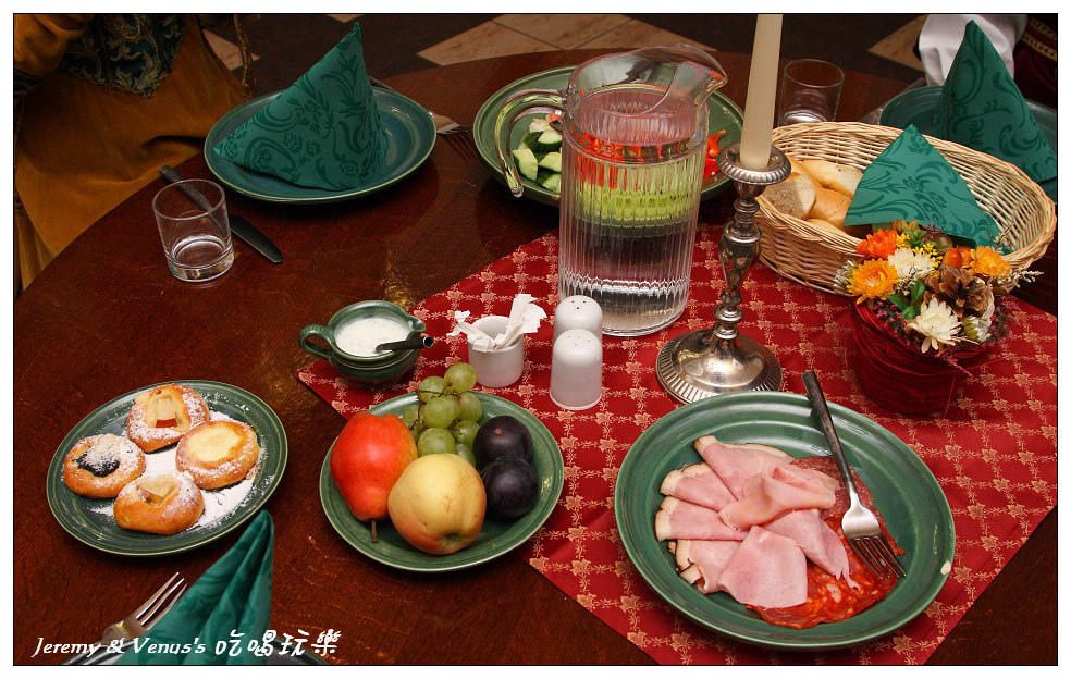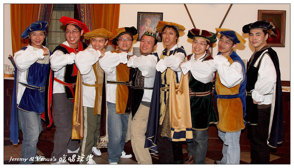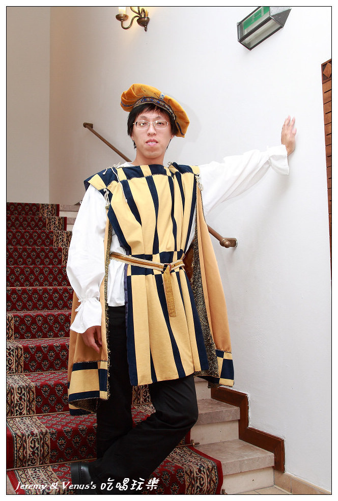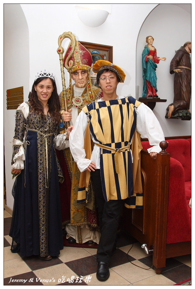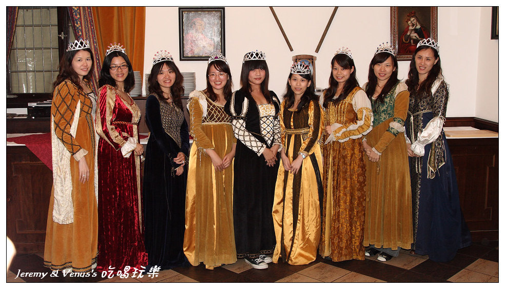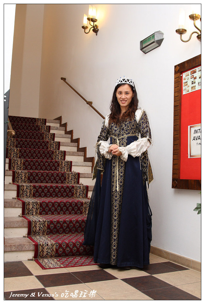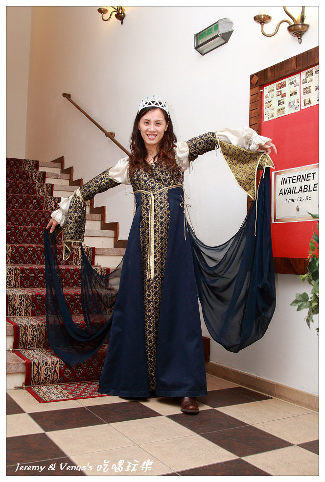來到了庫倫諾夫的百年薔薇飯店,大部分的台灣旅行團都會做的一件事,就是晚餐時還要搞個中古世紀變裝晚宴,大家穿上歐洲中古世紀時人們所穿的衣服,類似戲服之類的,穿著它,在裝潢成中古時期的餐廳裡用餐,雖然很不想換,可是來都來了,就換吧,來到了更衣間,女生在裡面,男生在外面,會有專人視你的身高體型來決定你穿哪件衣服,不過看起來應該是女生才有差別吧,因為女生的衣服真的有大有小,太大件的衣服瘦小的女生不能穿,所以得挑一下,不過男生就沒差了,只是換上衣而已,應該是隨便挑的,換好衣服後大家先拍拍照,才進到餐廳用餐。本來是不想放換裝後的照片的,不過為了讓大家知道那衣服長得什麼樣子,還是放幾張吧。