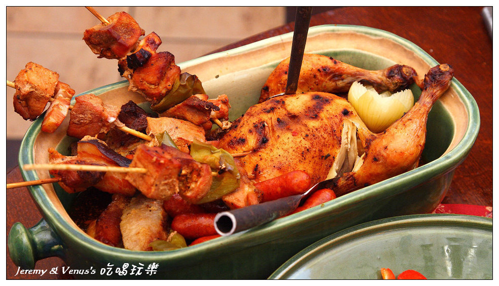 肉類,有一整隻烤雞、四串肉串、四根香腸、一堆滷豬肉