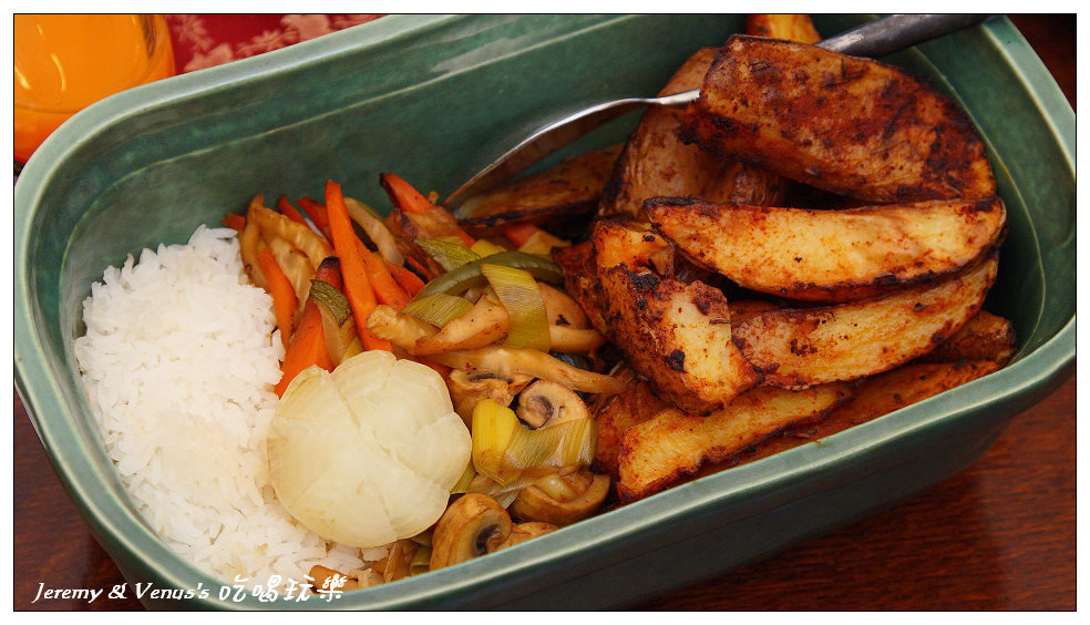 一些白飯、煮菜、蘑菇、一大堆的馬鈴薯