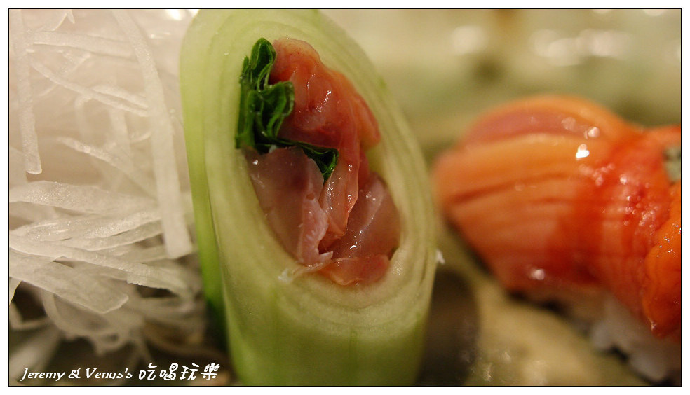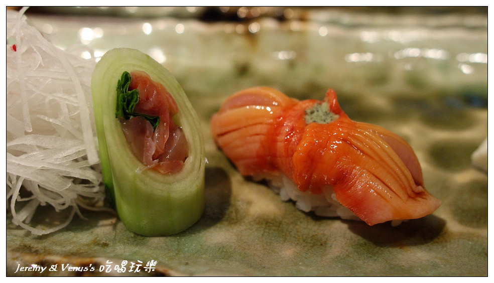赤貝唇卷,外頭是小黃光削成薄片捲起赤貝唇跟紫蘇葉