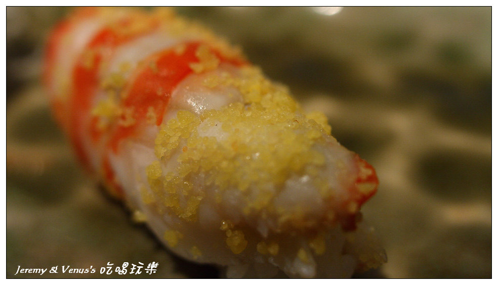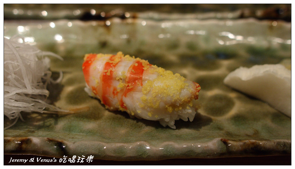 玉子握壽司,上頭是蝦鬆,用蝦肉跟甘醋炒........