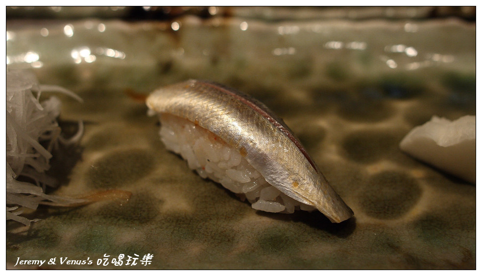 小鯽握壽司,魚肉跟醋飯之間夾有魚鬆,用魚肉跟甘醋炒出來的,捏製過程還得先把小鯽跟魚鬆放在一起幾分鐘後再捏壽司,這樣魚肉跟魚鬆味道才會搭