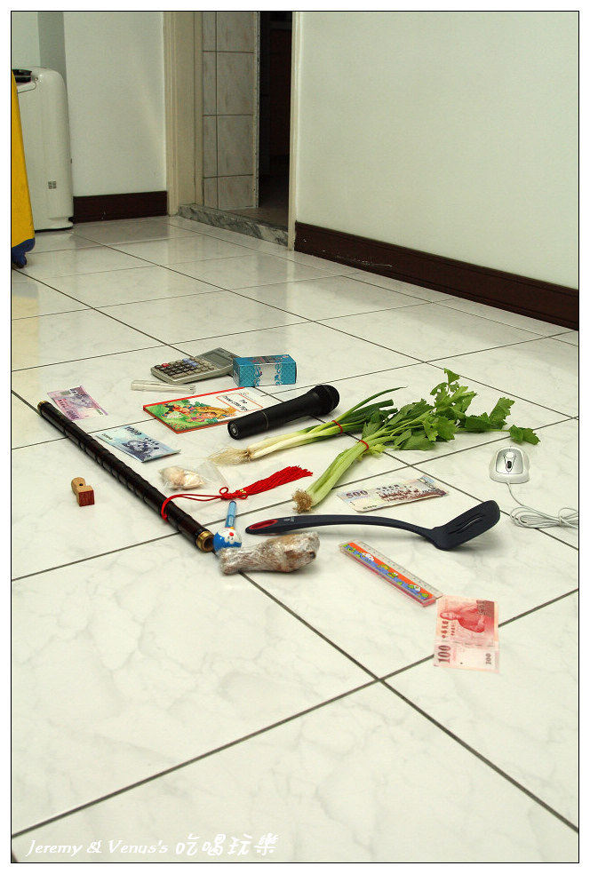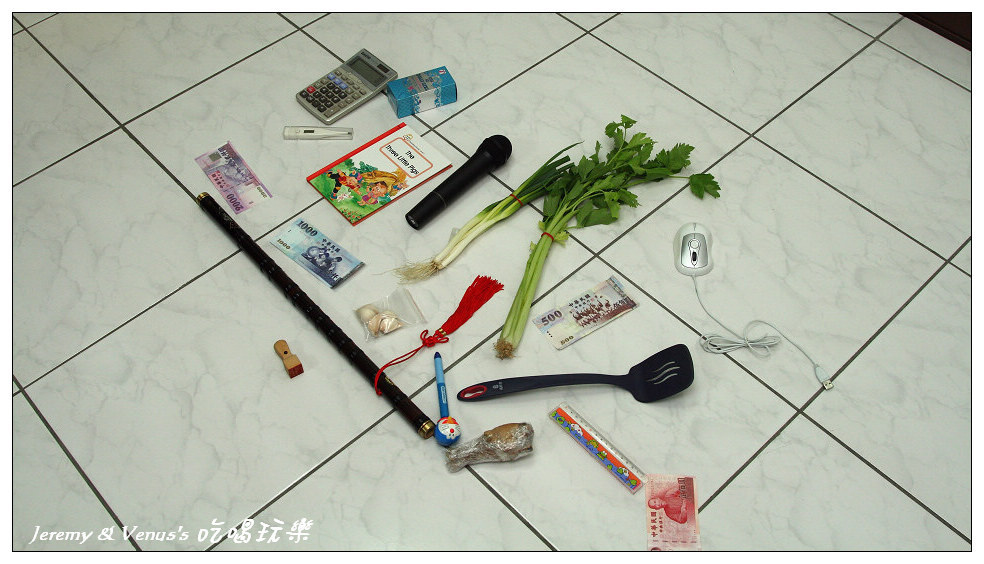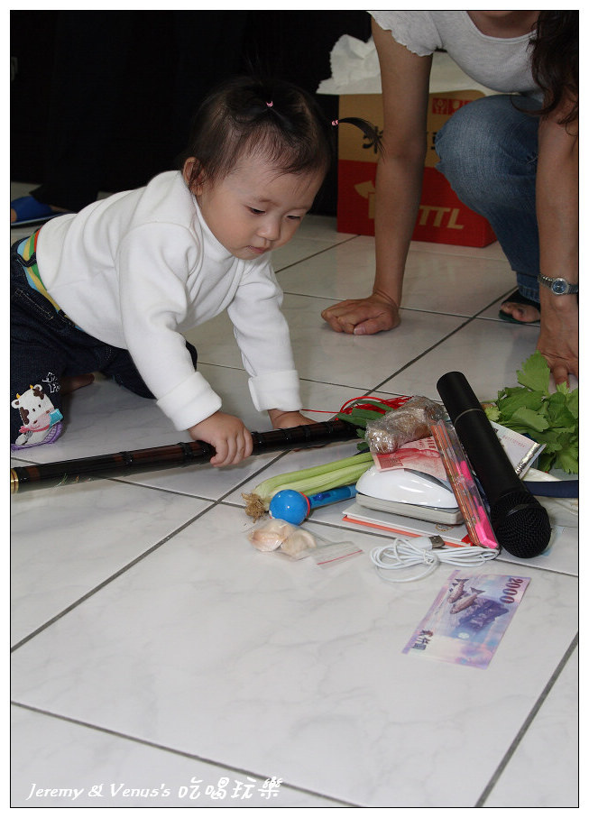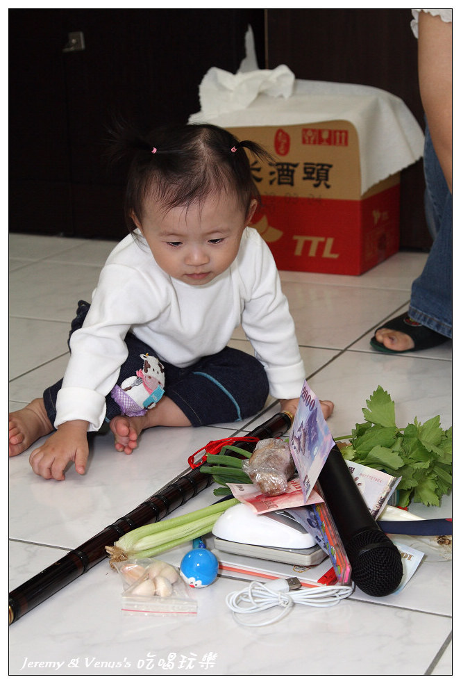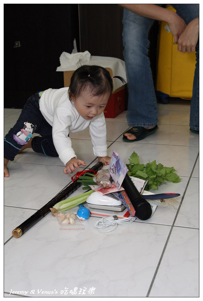 抓週物品一欄表,除了習俗應有的之外,我們有作刪減與增加部分,例如刪除稻草(不想給她當農夫)、刀劍(不想給她當軍官),增加了鍋鏟、麥克風、香水(其實最希望她拿到香水)。