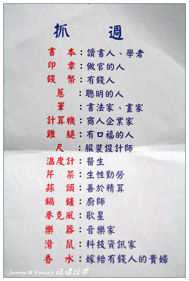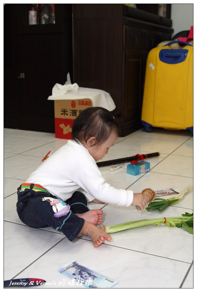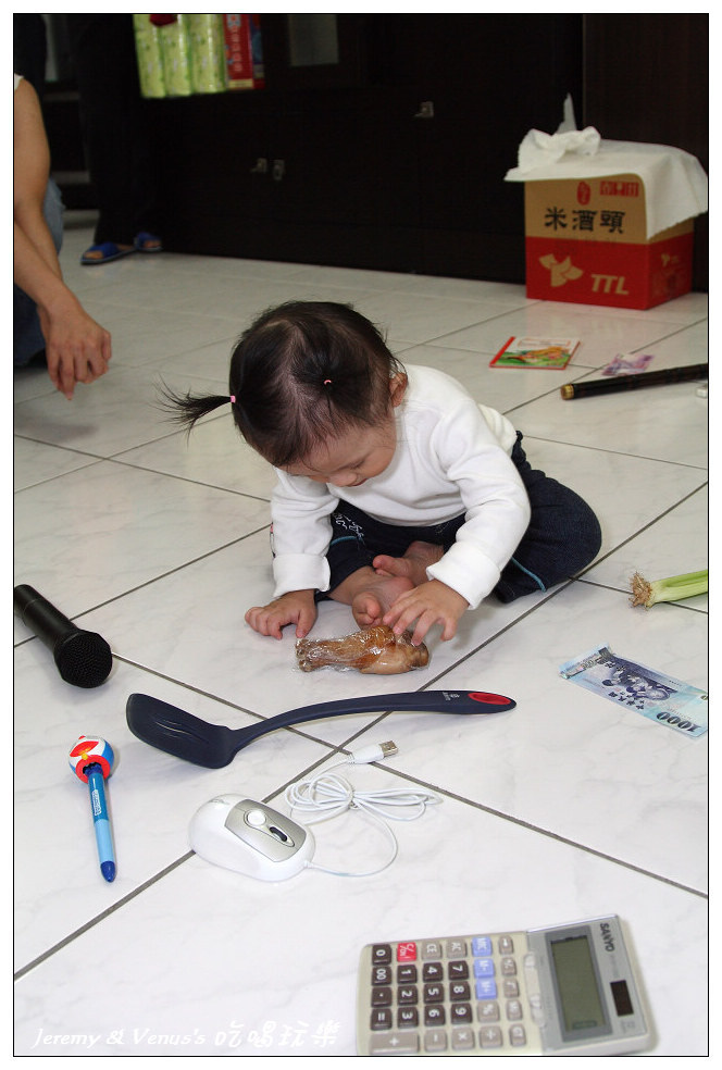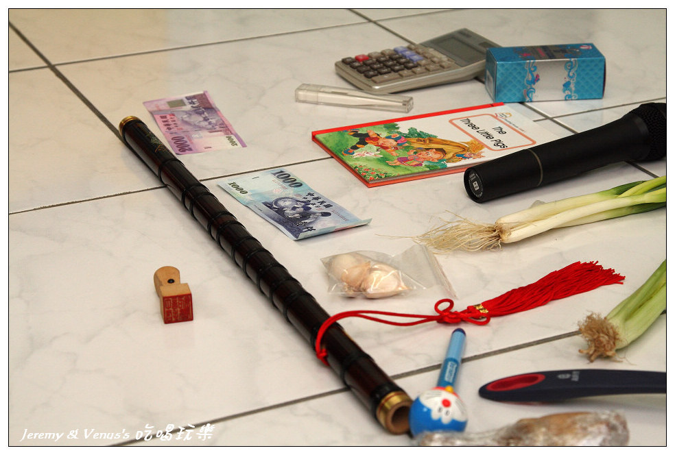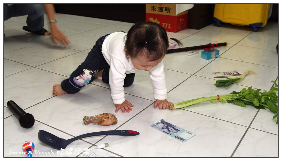 抓週物品一欄表,除了習俗應有的之外,我們有作刪減與增加部分,例如刪除稻草(不想給她當農夫)、刀劍(不想給她當軍官),增加了鍋鏟、麥克風、香水(其實最希望她拿到香水)。