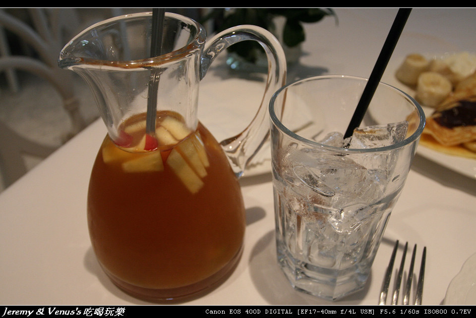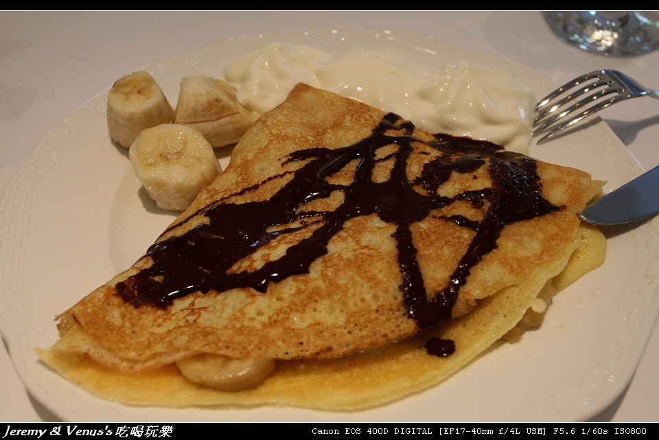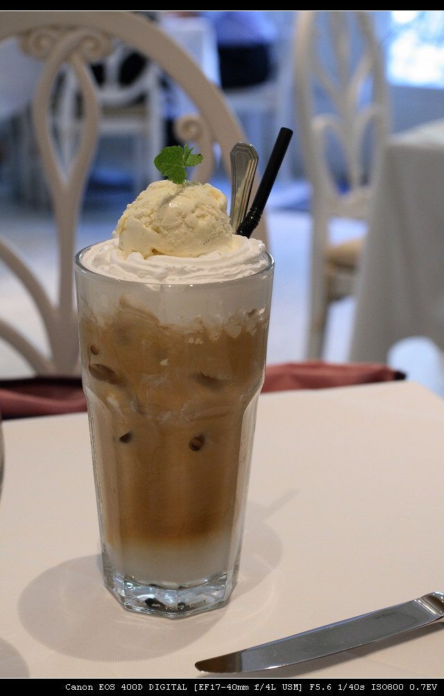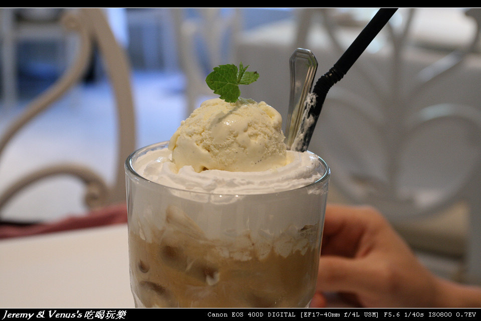 雖然這一篇沒啥照片,不過還是補上來好了,上次中午吃完野壽司,來到南京西路商圈這邊逛逛,突然想到在P哥家裡看過這一家店,於是就進來看看,不過外頭的太陽實在太毒辣了,所以沒拍啥外觀照片,它就是在商圈裡頭非常突出的一棟別墅,外觀是白色的三層樓建築,遠遠一看會以為是哪戶有錢人家的別墅,不過目前裡頭是經營餐廳,有正餐及甜點飲料供應,我們只是想進來看看吹吹冷氣,裡頭的店員及服務生不論男女個個都是身材高挑的帥哥美女,店內的裝潢如同其外觀一樣有都是以白色系為主,並且有一些頗有特色的擺飾,至於餐點,我本來是想點烤牛肉三明治的啦,因為在P哥家看起還好像很好吃,不過最後也不知道為什麼點了這焦糖香蕉薄餅的,飲料是水果茶及漂浮冰咖啡。算是一家很適合三五好友來聊天喝下午茶的好地方,當然也可以來吃正餐啦,不過正餐價格不便宜,還不如去其他西餐廳吃。